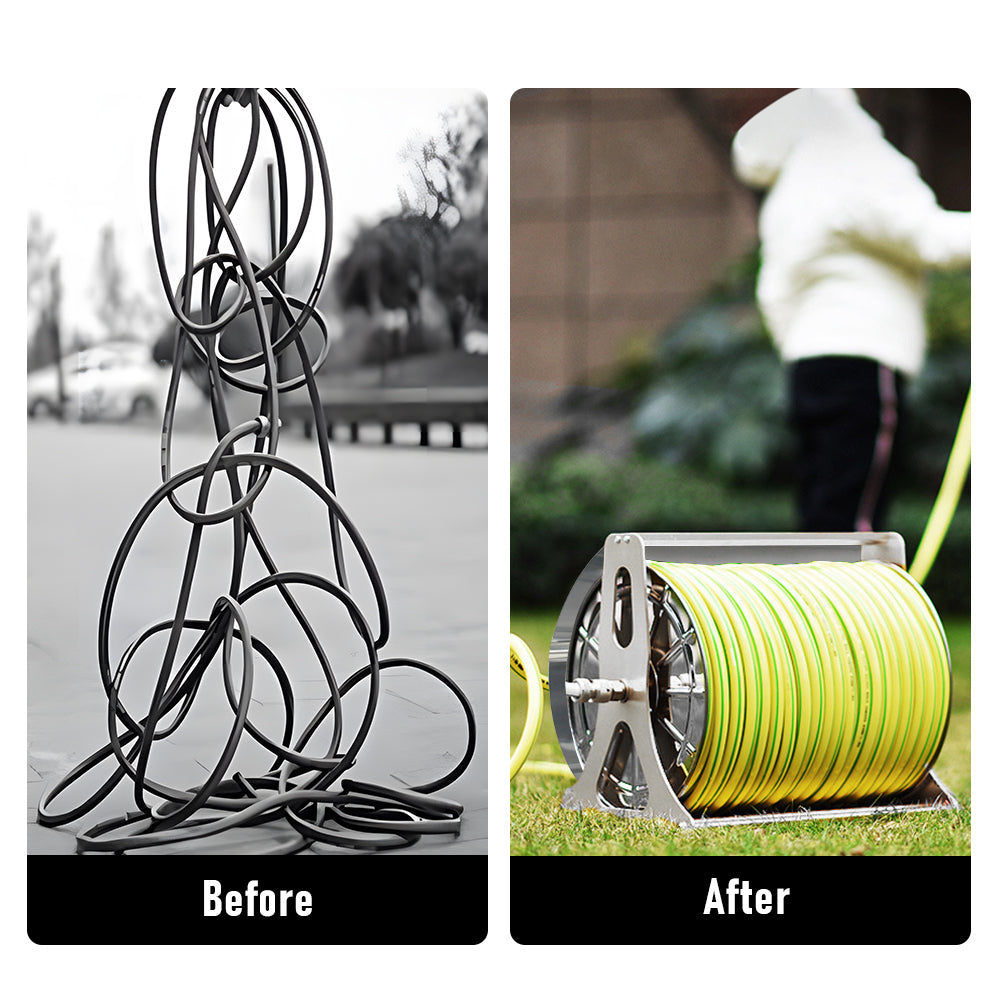 Introducing our Stainless Steel Hose Reel Cart, large capacity,durable and easy to use with a crank handle for winding.With a rainproof, sunscreen-protected lid,it helps to prolong the service life of water hose.It can be attached to the wall with the hooks or stand on the ground.Perfect for various gardening jobs.