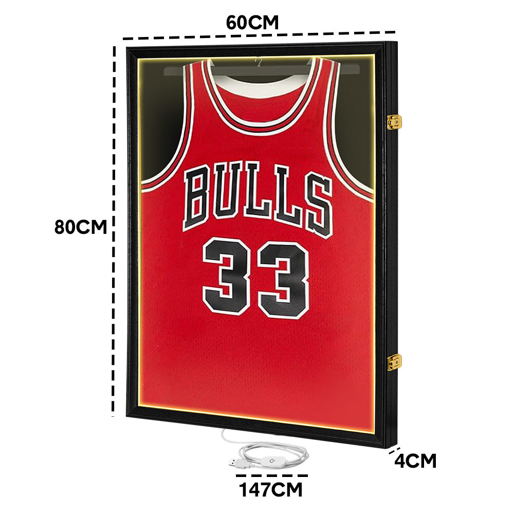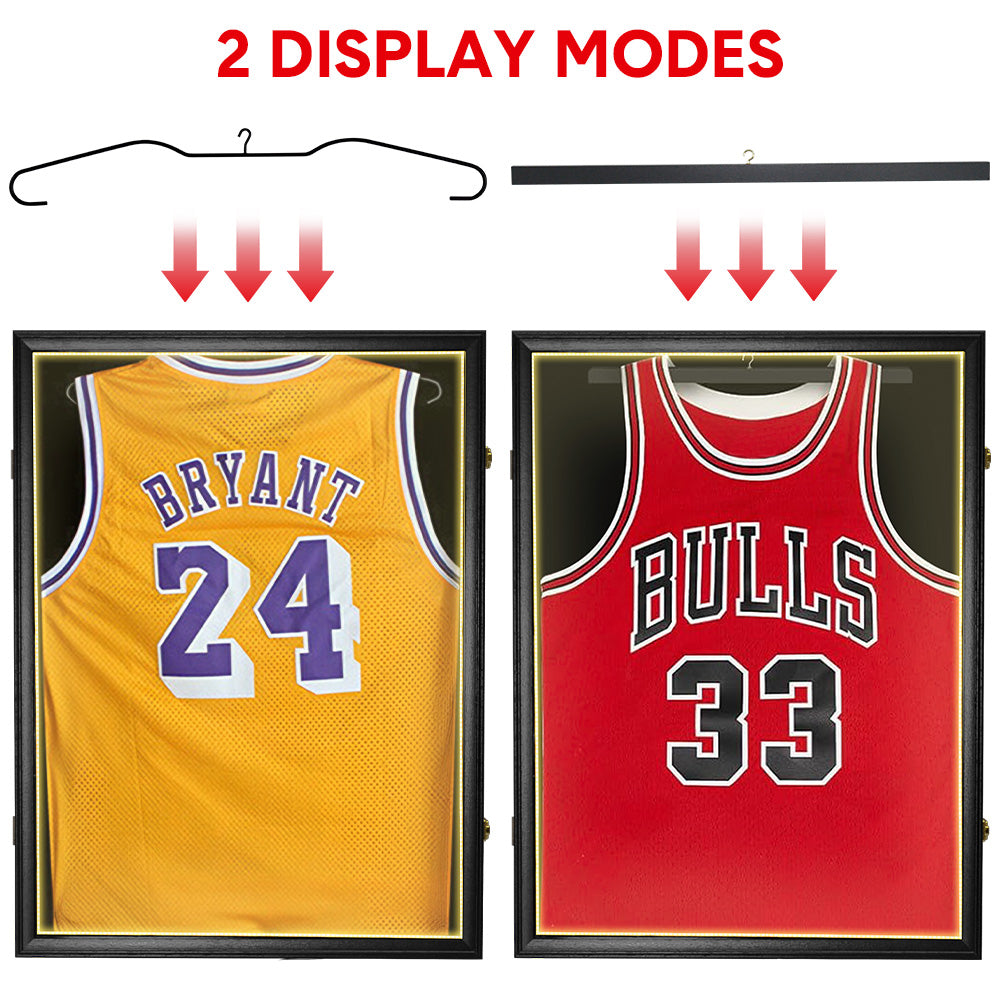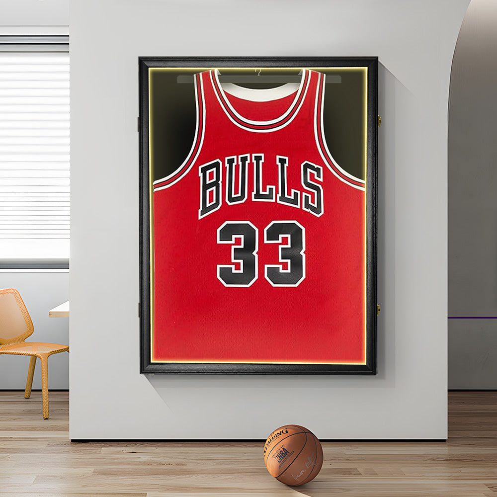 Equipped with a built-in LED strip, UV-protected acrylic door, sturdy backboard, and sleek black felt interior, this frame offers both durability and elegance. Multiple display options let you present jerseys your way, while the lockable door keeps them safe from dust and accidental damage. Perfect for jerseys of all sizes and sports.
