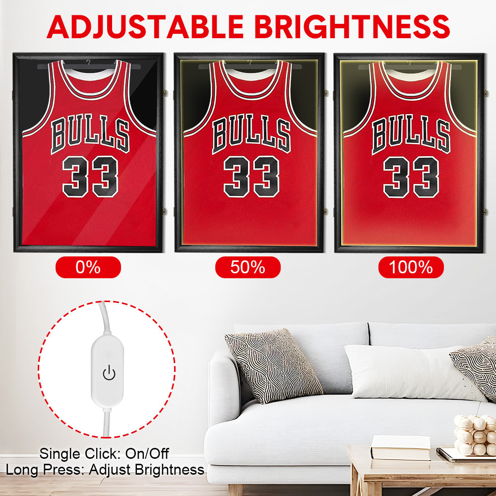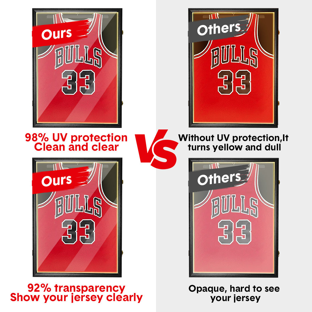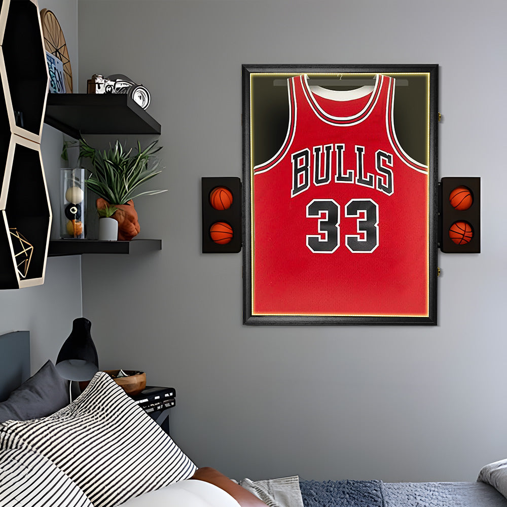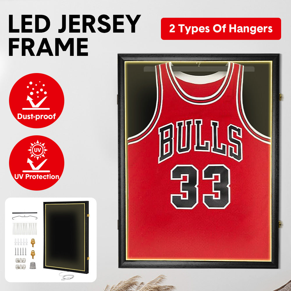 Equipped with a built-in LED strip, UV-protected acrylic door, sturdy backboard, and sleek black felt interior, this frame offers both durability and elegance. Multiple display options let you present jerseys your way, while the lockable door keeps them safe from dust and accidental damage. Perfect for jerseys of all sizes and sports.