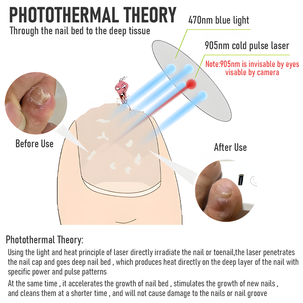Combat nail fungal infections (Onychomycosis) from the comfort of home with our cutting-edge Nail Fungus Laser Device. Harnessing the power of 905nm Super Pulsed Lasers and 470nm Blue Light, this innovative device offers a synergistic therapeutic approach, effectively treating nail fungus and promoting healthier nails.