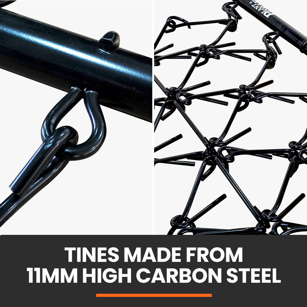 With an operating width of 1.4m and a length of 1.6 m, this chain harrow provides expansive coverage - ensuring efficient and effective soil conditioning for agricultural, landscaping, and sports field management and preparing lands for various uses. The heavy-duty tines are designed to penetrate deeply into the soil up to a maximum operating depth of 95 mm, breaking up soil clumps and smoothing out uneven terrain for excellent soil aeration to promote healthy root growth.
