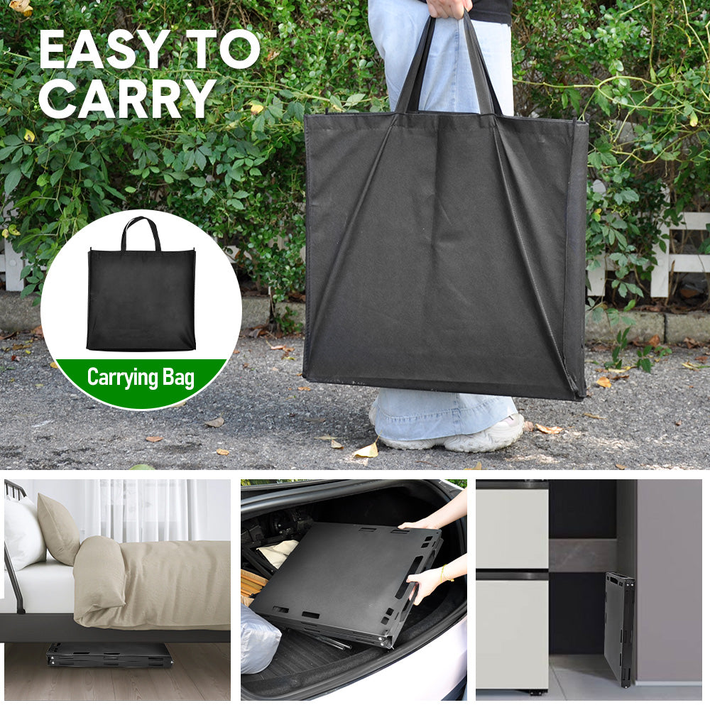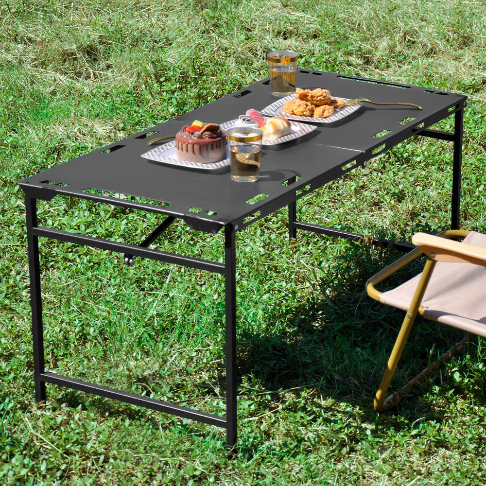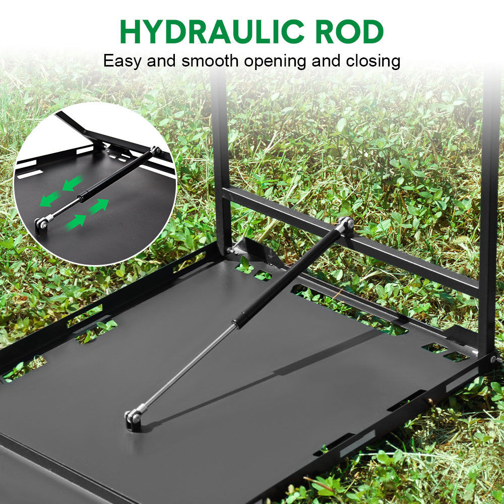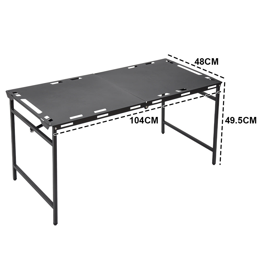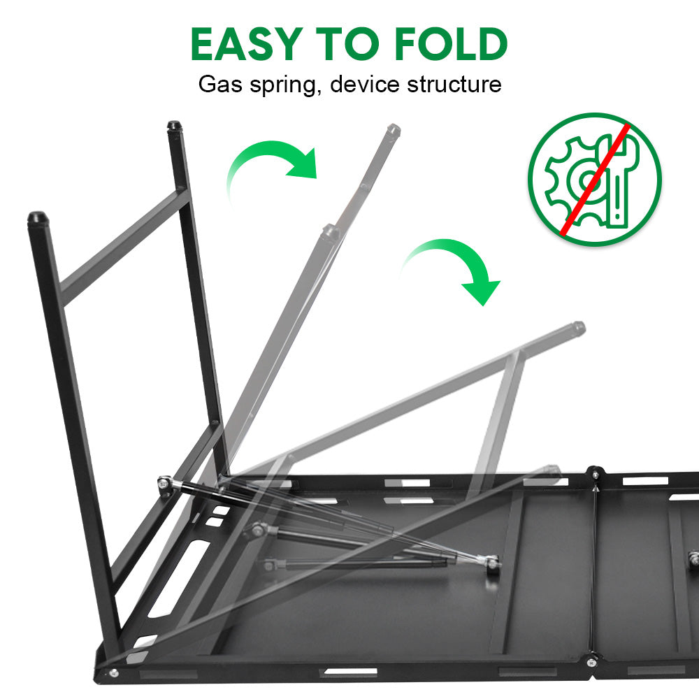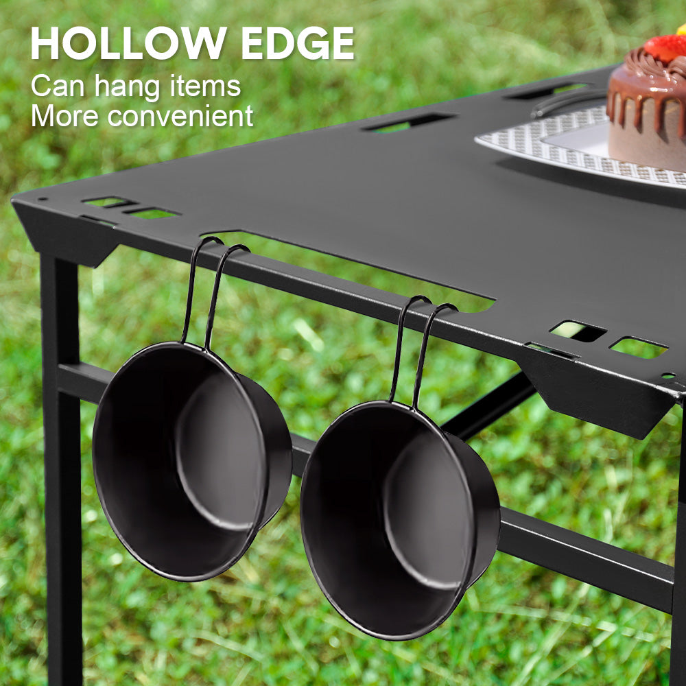 Made from high-quality iron with a protective coating, the table resists rust, scratches, and outdoor wear. Equipped with two hydraulic rods, the tabletop opens smoothly and locks into place in seconds. Built-in handles on both ends allows for easy carry. Tactical side holes let you hang tools, small items or more essentials.