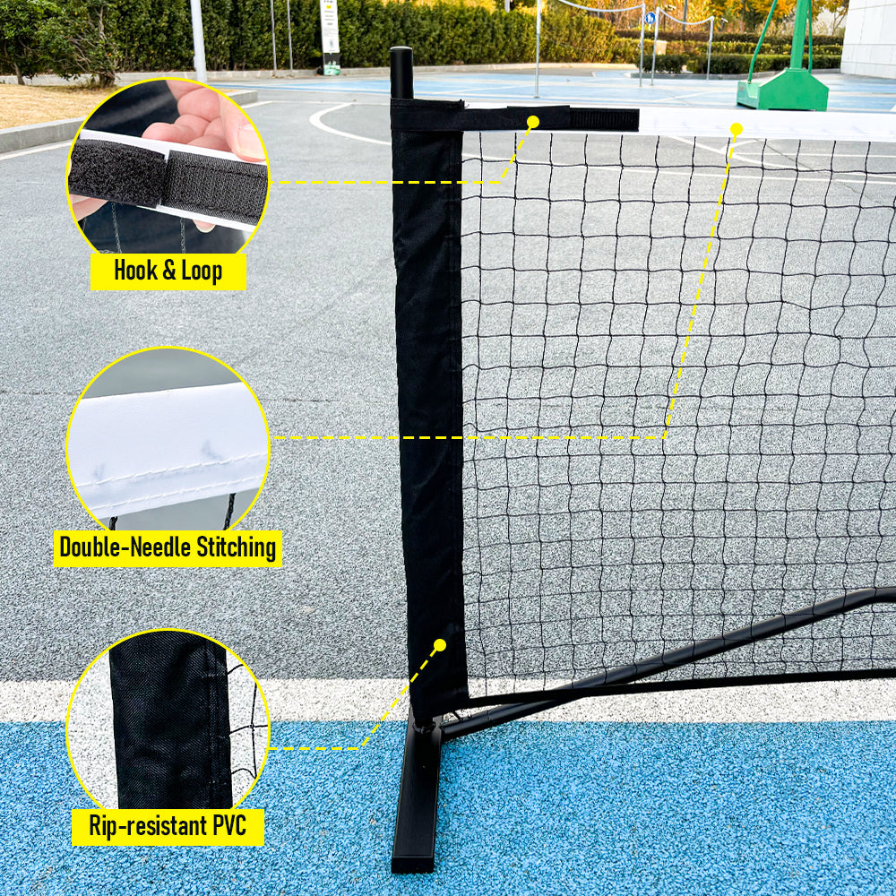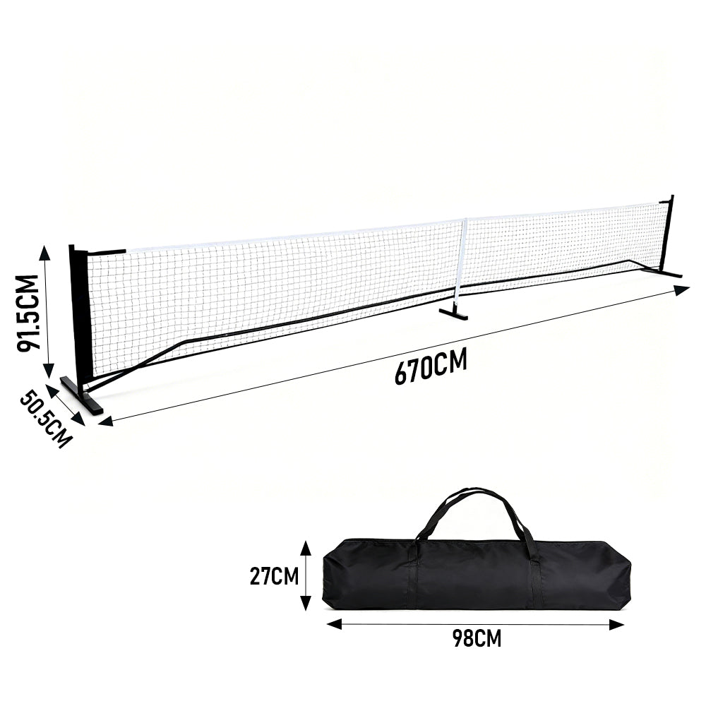 Measuring a standard length of 6.7m, this pickleball net features a sturdy metal frame and durable nets, ensuring reliable setup and stability during intense matches and making it suitable for players of all skill levels. It can be easily disassembled for easy carry with the included bag. Perfect for any casual or group match in backyards, parks, schools, or courts.