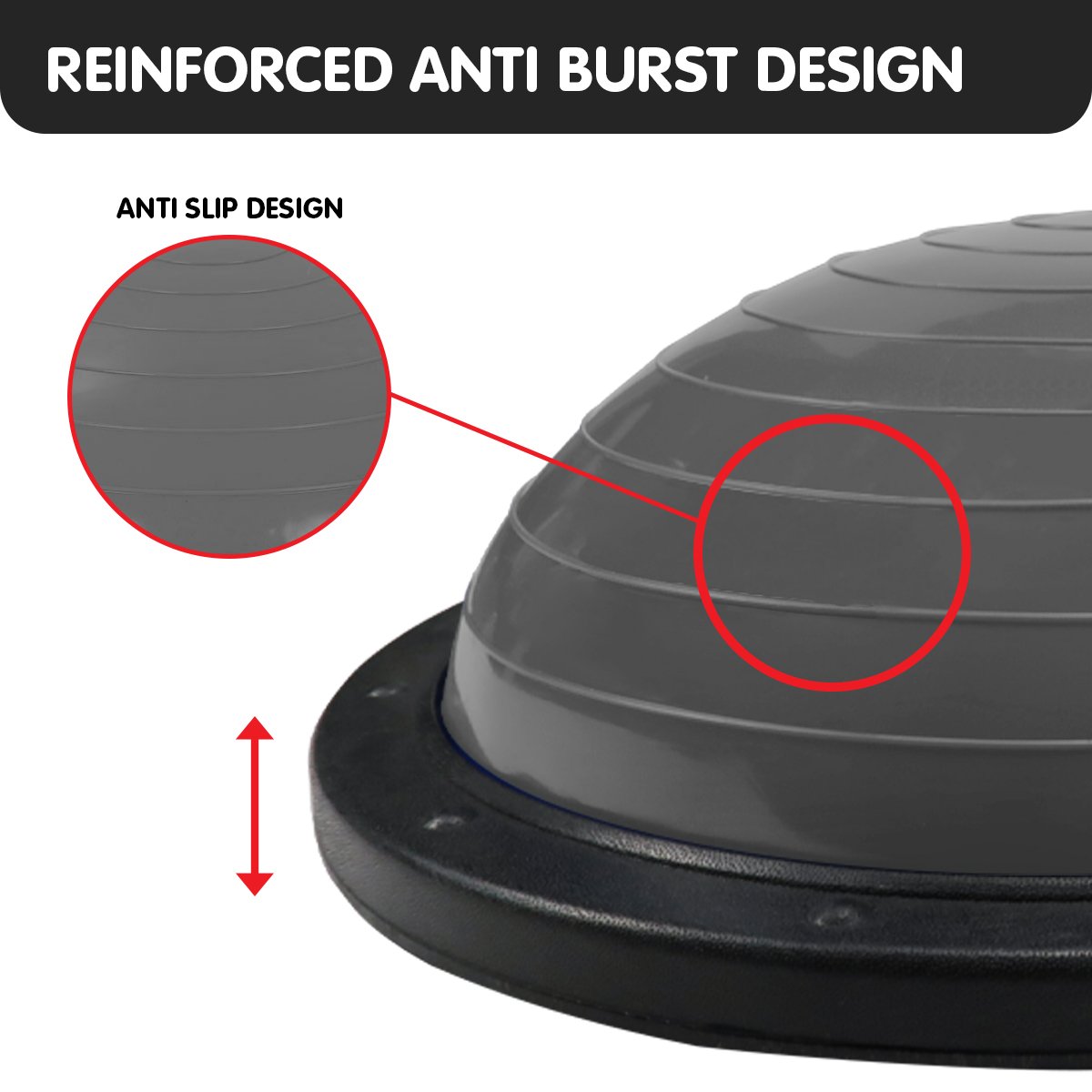 This unique balance ball features a flat side to provide a stable base, as well as a dome for balance challenges to tone the upper and lower body. With 8 rubberized anti-slip floor pads, there's no need to worry about sliding around during an intense workout.
