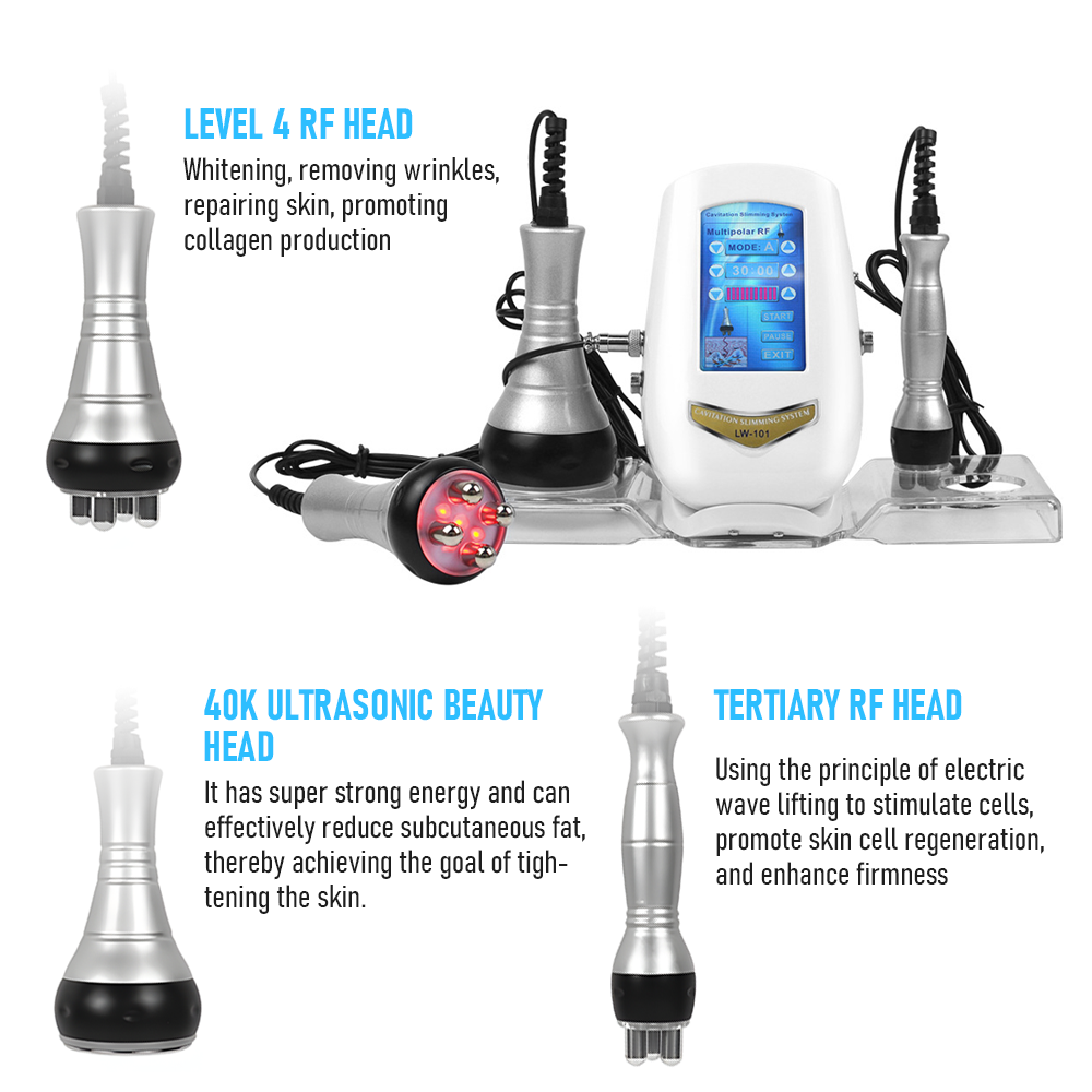 This 3 in 1 cavitation machine focuses on radio frequency to break down the fat cells and realize the effects of body shaping. With RF energy, the device can also promote metabolism, so as to restore facial rejuvenation.