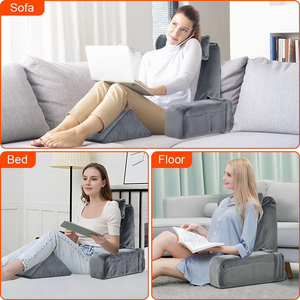 Built with a sturdy triangular back support, this pillow stays stable while keeping your posture aligned. Its velvet cover feels soft and breathable, while the high-quality foam maintains its shape over time. Handy side pockets keep essentials within reach, and the Velcro design makes cleaning or setup a breeze.