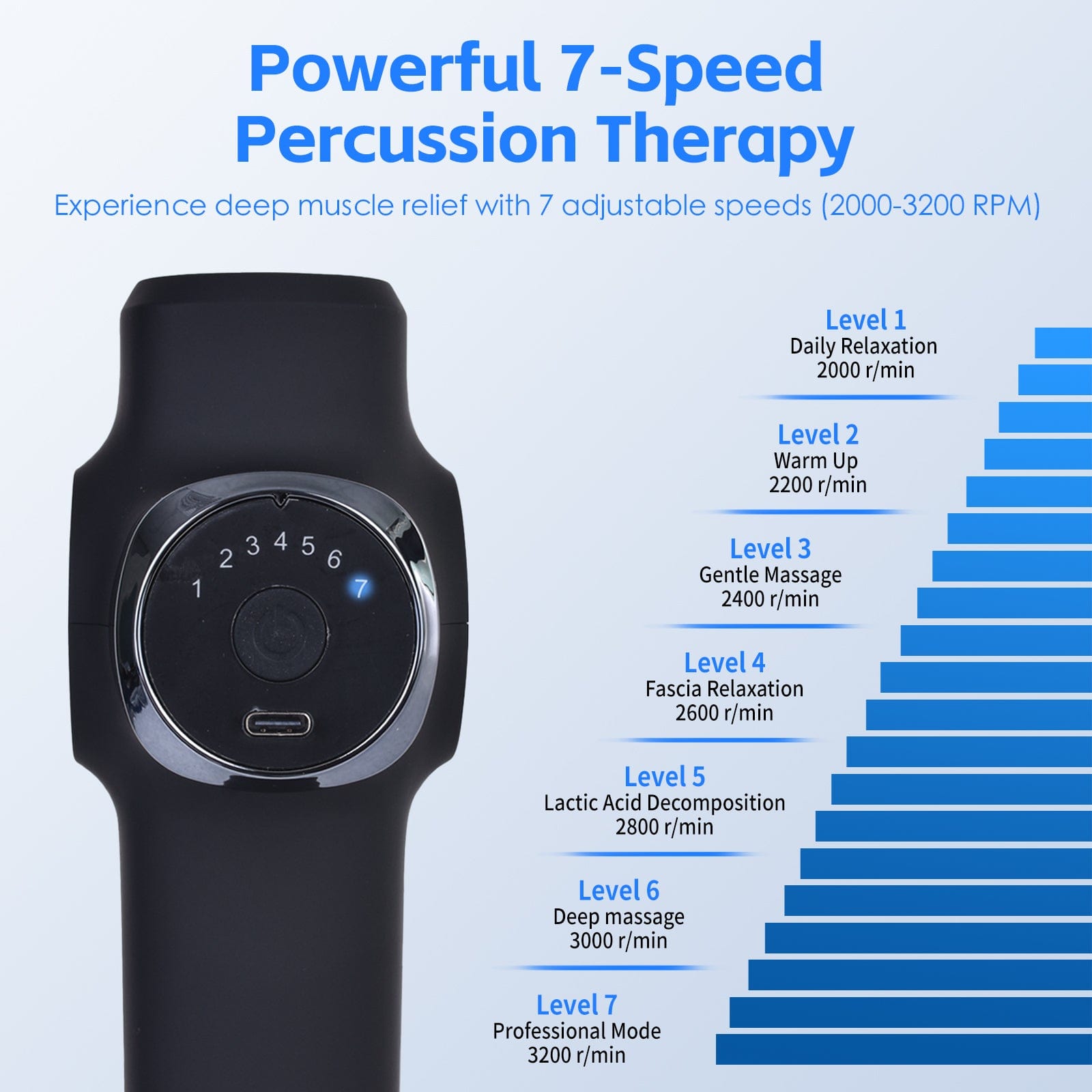 Automatic speed and shock adjustment based on detected pressure. To provide you with a more accurate and tailored percussion massage experience. This massage gun offers a variety of speeds for hard-to-reach muscle groups. In addition, the small and compact design makes it easier to use and more power-efficient.