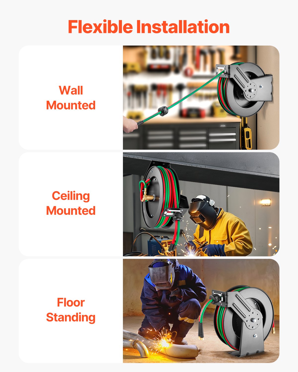 Retractable 1/4 in x 50FT oxygen acetylene rubber hose reel with durable steel construction and auto-rewind for efficient hose management.