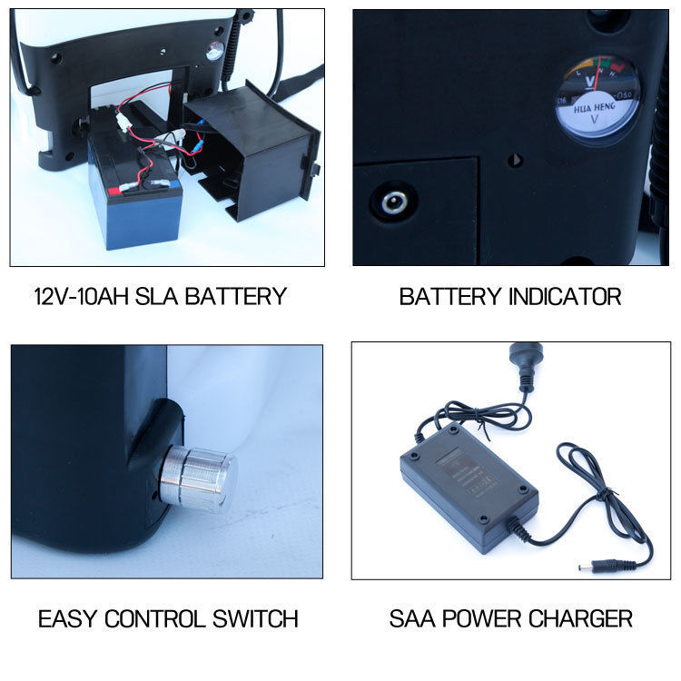 Adjustable spray speed flow controller, Battery charging socket and battery indicator meter