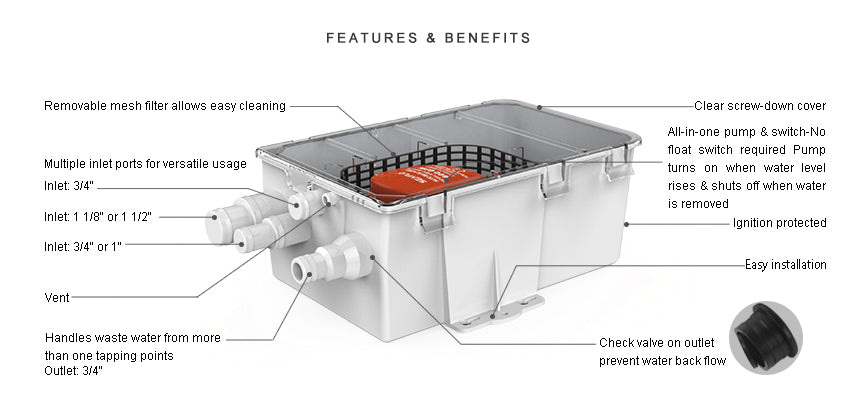 A built-in check valve on the outlet prevents backflow, while the all-in-one pump and float switch eliminate the need for an additional float switch. Constructed for easy cleaning and versatile usage, this sump pump system ensures hassle-free water management on board.