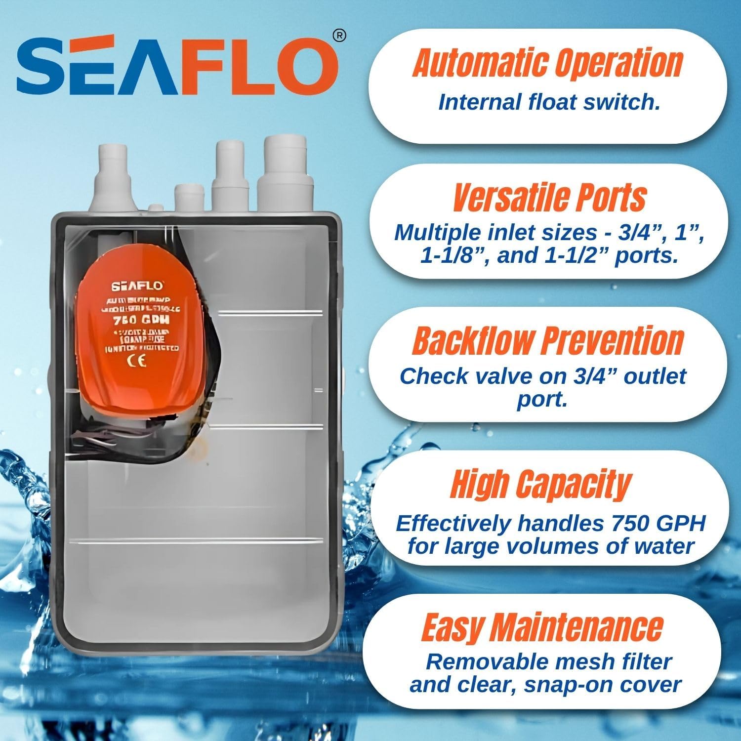 The SEAFLO 07 Series Sump Pump System is designed to handle shower and sink wastewater in marine and RV applications. Equipped with multiple inlet ports and a 750GPH capacity, this compact unit is fully automatic, turning on when water levels rise and shutting off when levels fall.