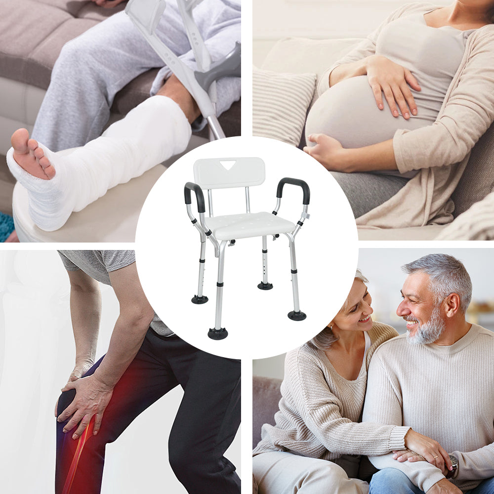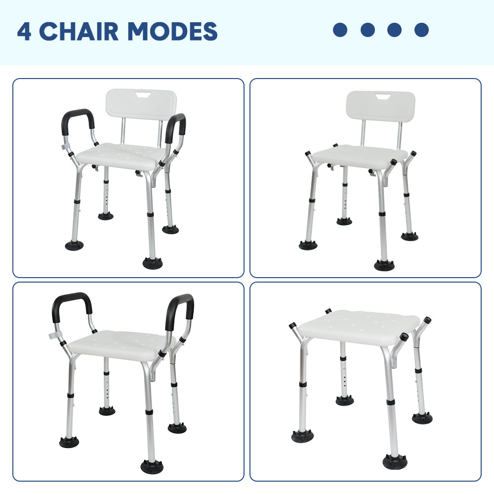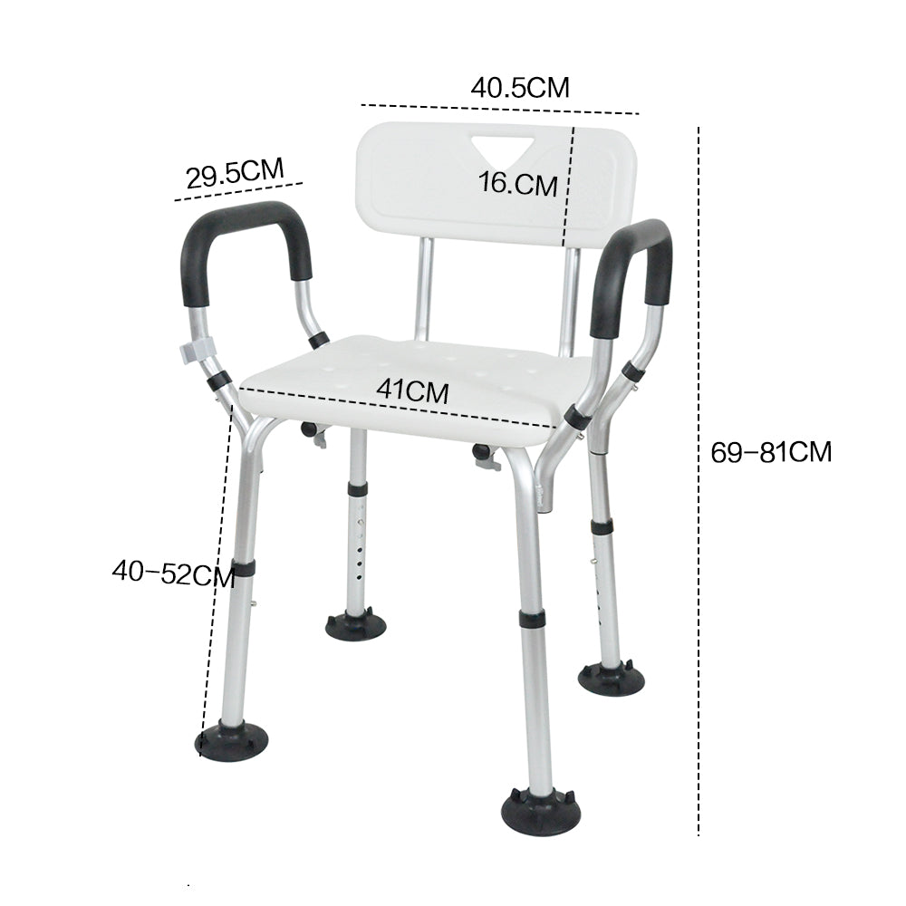 The Shower Chair offers robust construction with PE and aluminium alloy, ensuring durability and resistance to rust. It features secure armrests for stability. Non-slip feet ensures enhanced safety. With five adjustable height settings, it accommodates individuals of different height, ensuring a personalized fit.