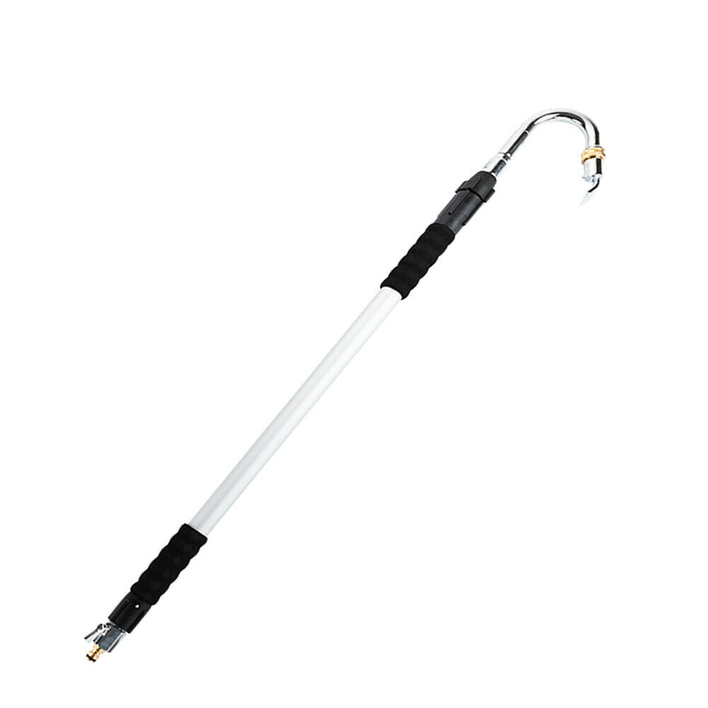 The Stainless Steel Pressure Washer Gutter Cleaner features a durable aluminum alloy pole,stainless steel gooseneck, and zinc brass-plated valve.Its 180-degree nozzle and adjustable length (1.05m to 1.75m) make it ideal for hard-to-reach areas.It offers a high-pressure spray and non-slip grip for comfortable use.
