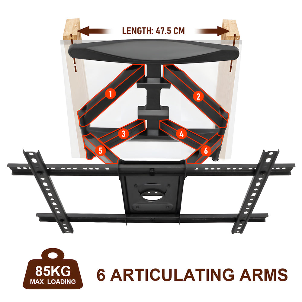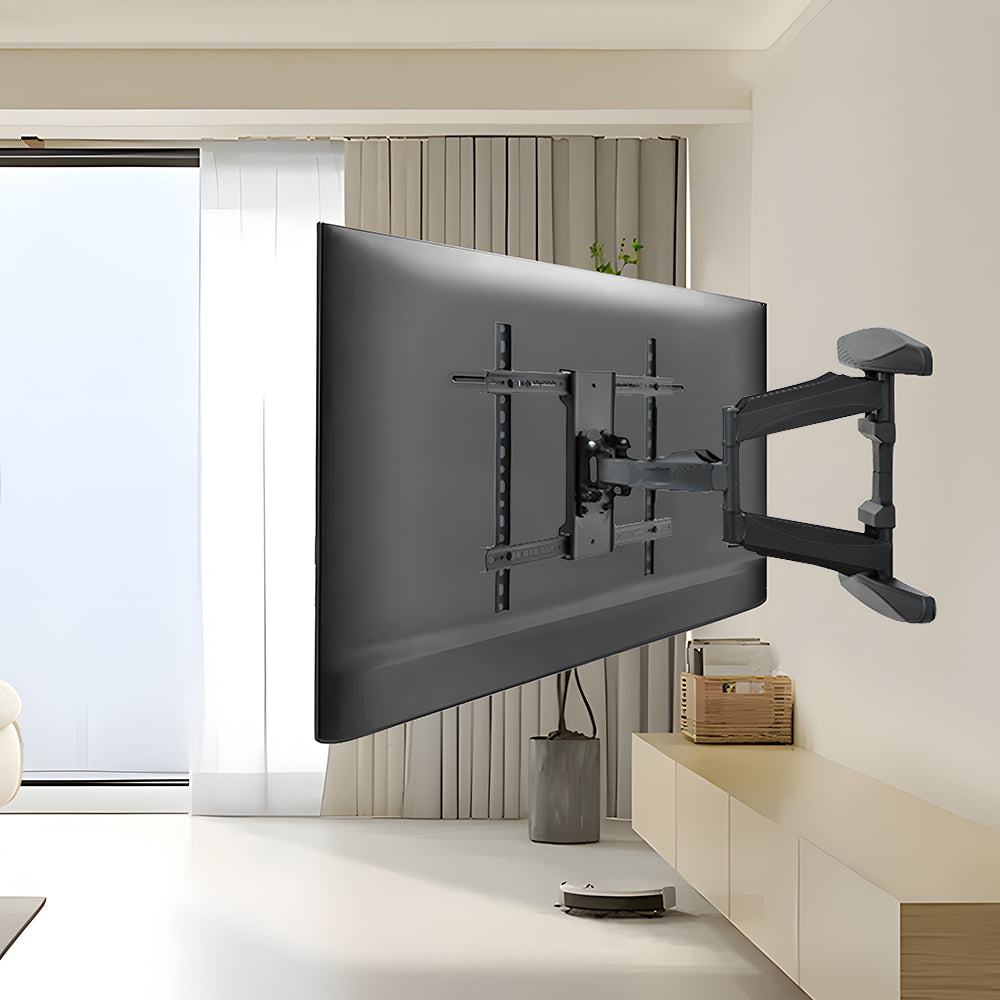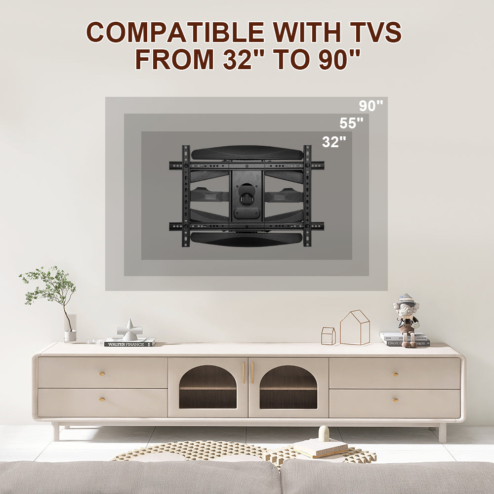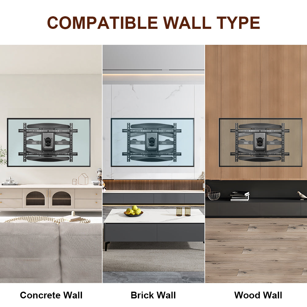 Supporting flat-screen TVs from 32 to 80 inches, our Wall Mount Full Motion TV Backet includes a retractable telescopic arm and offers adjustable angles, ensuring a perfect viewing experience from any spot in the room. It can be mounted on concrete, brick, and wood walls and save your valuable floor space.