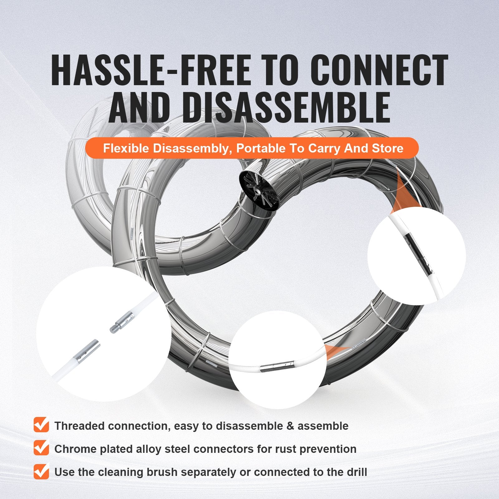 This pipe cleaning brush can quickly extend up to 40 feet, allowing you to easily reach distant or deep sections of pipes, such as those running through roofs, basements, and attic spaces. By expanding the cleaning range, it greatly enhances cleaning efficiency.