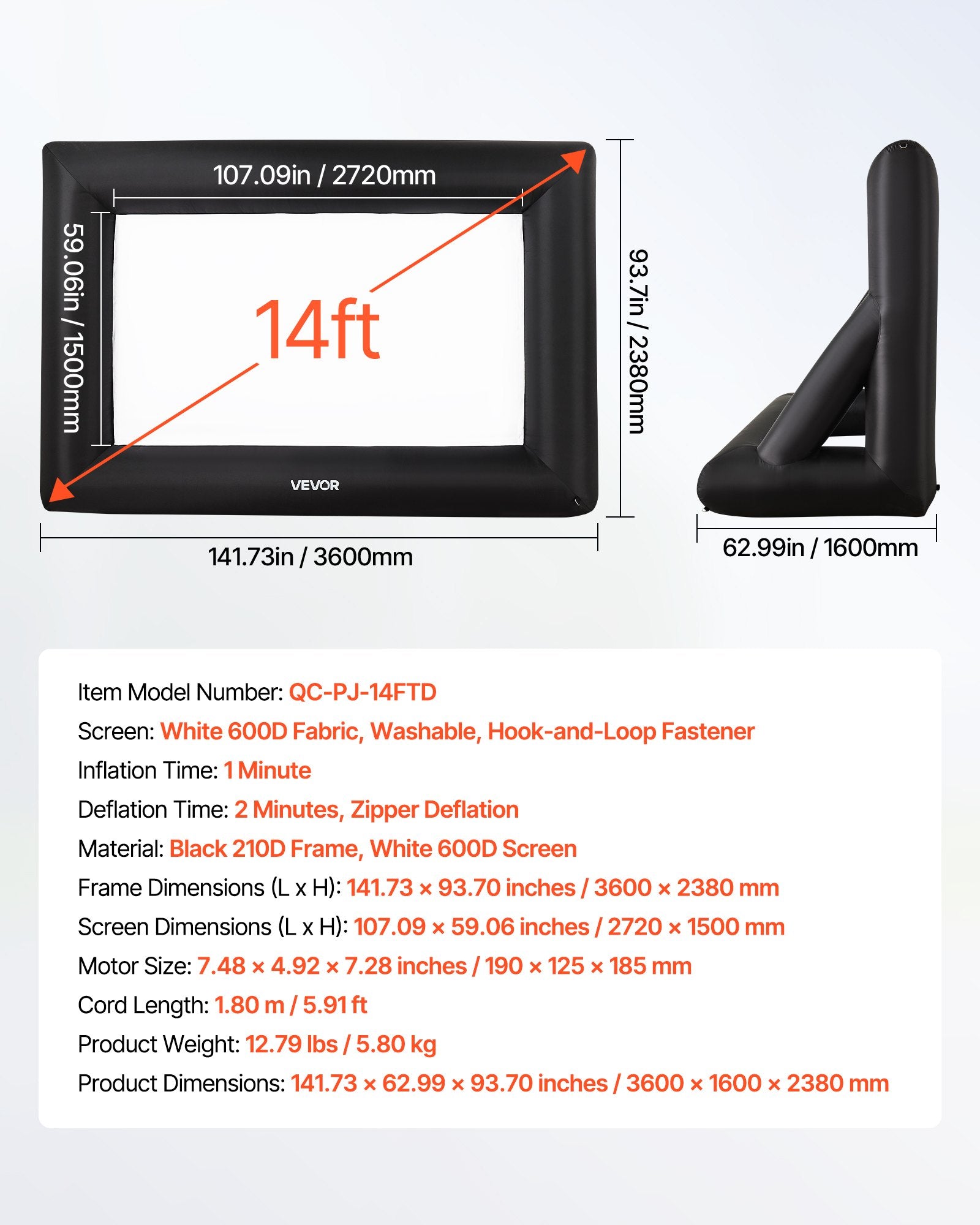 14 ft inflatable movie screen with 16:9 aspect ratio, made from durable 600D fabric, includes a portable bag for easy transport.