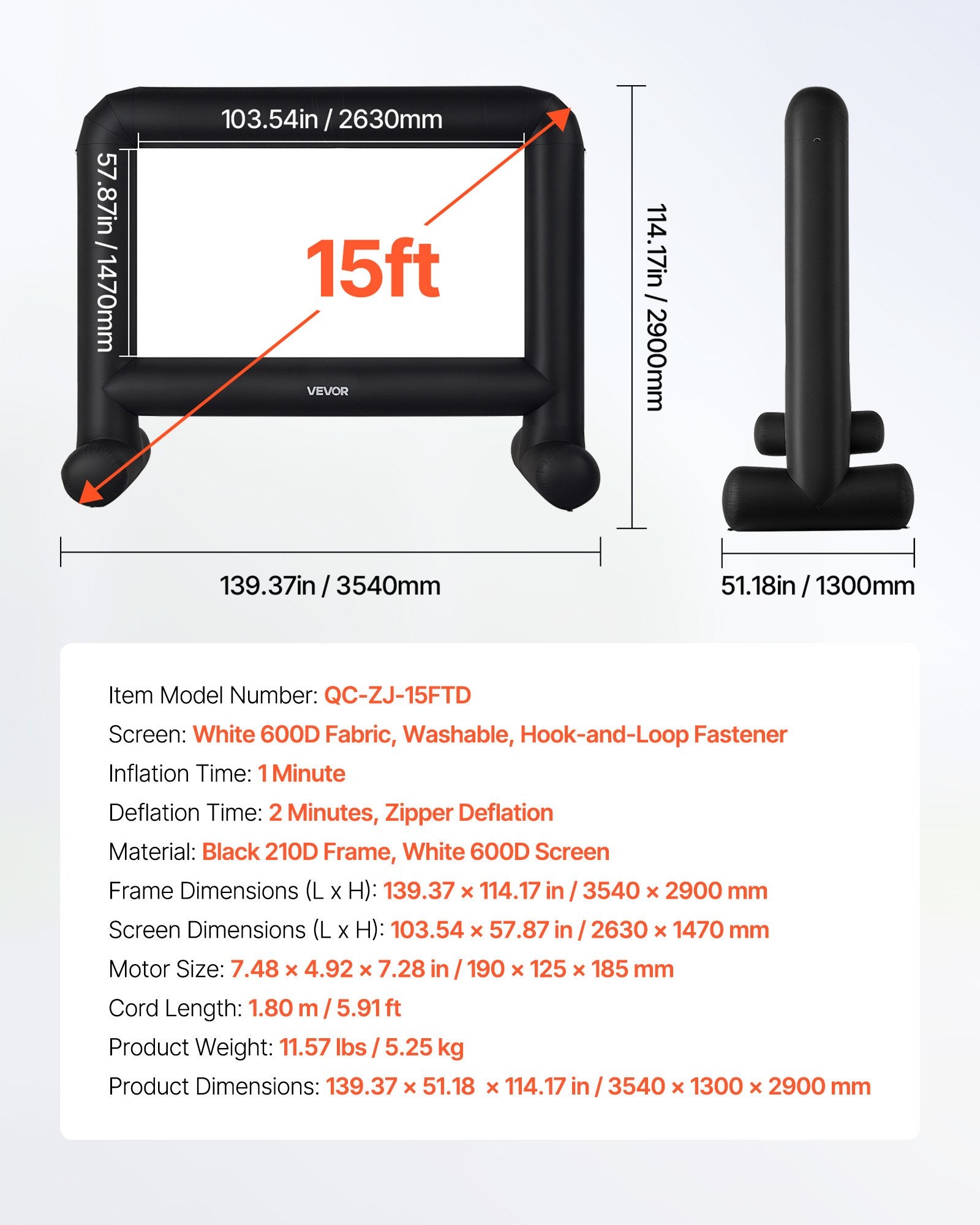 15 ft inflatable movie screen with 16:9 ratio, made from durable 600D fabric, includes a portable bag for easy transport.