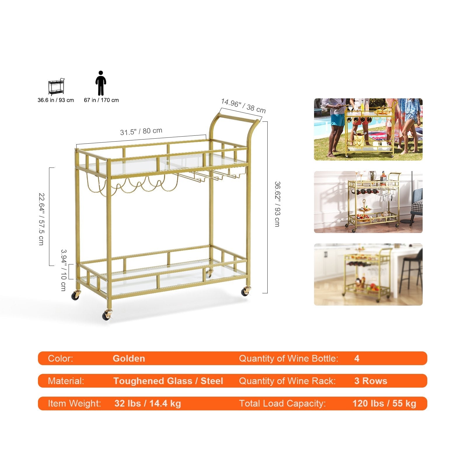 Measures 33.7x15x36.6 inches. This gold wine cart on wheels can fit in various places and hold up to 120 lbs. That is a lot of weight! It has an open storage compartment, a wine rack, and hanging glass storage. Get ready to holds 4 wine bottles and 3 rows of wine glasses for any special occasion. Cheers to you!