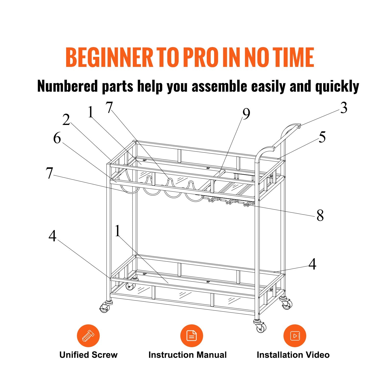 The liquor cart provides all necessary accessories and detailed instructions. It comes with unified screws and clear and brief instructions. All parts are provided with labeled numbers, and each assembly step is listed clearly. You can easily understand the assembly process, wasting little time and energy. Start preparing your favorite wines and dishes!