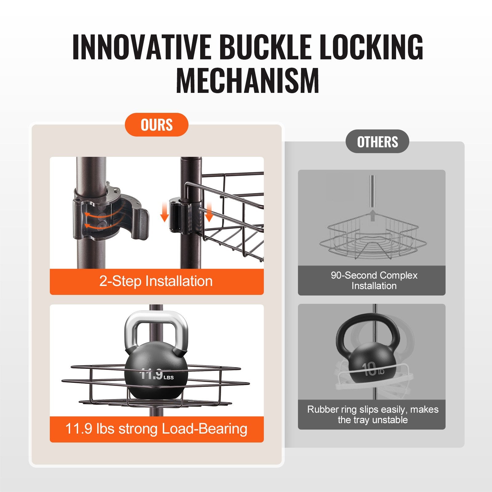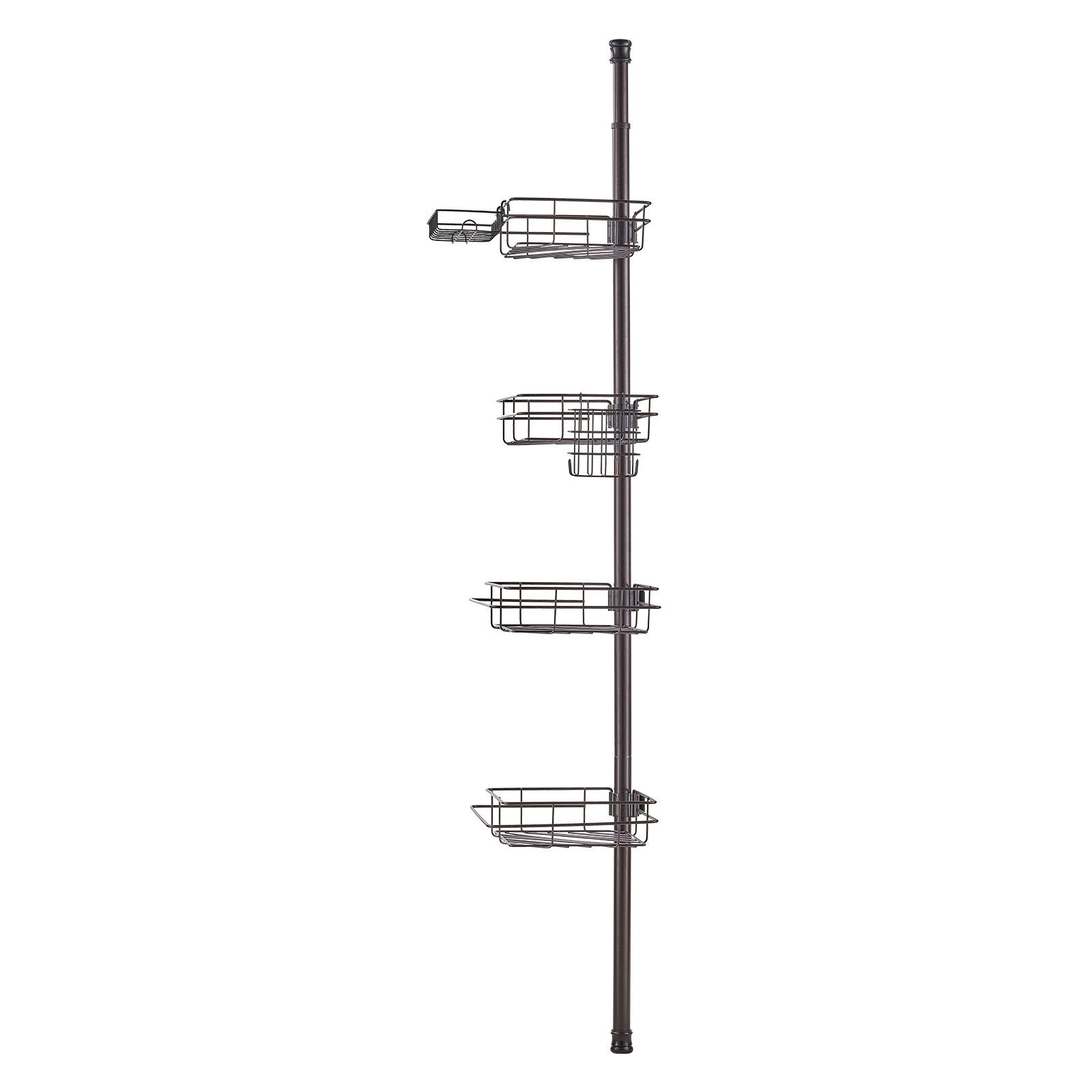 Adjustable shower corner caddy tension pole with rust-proof stainless steel construction and multiple storage options.