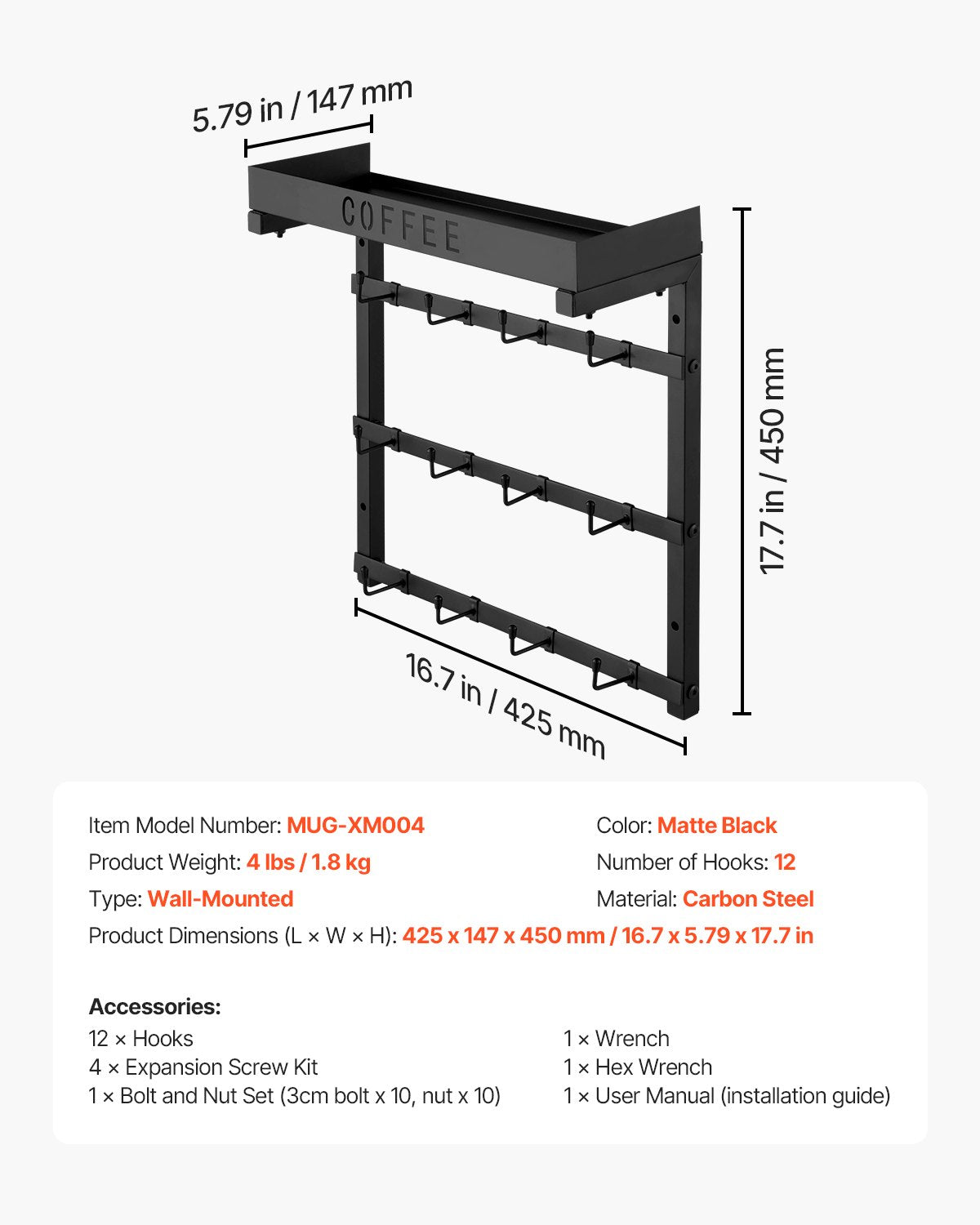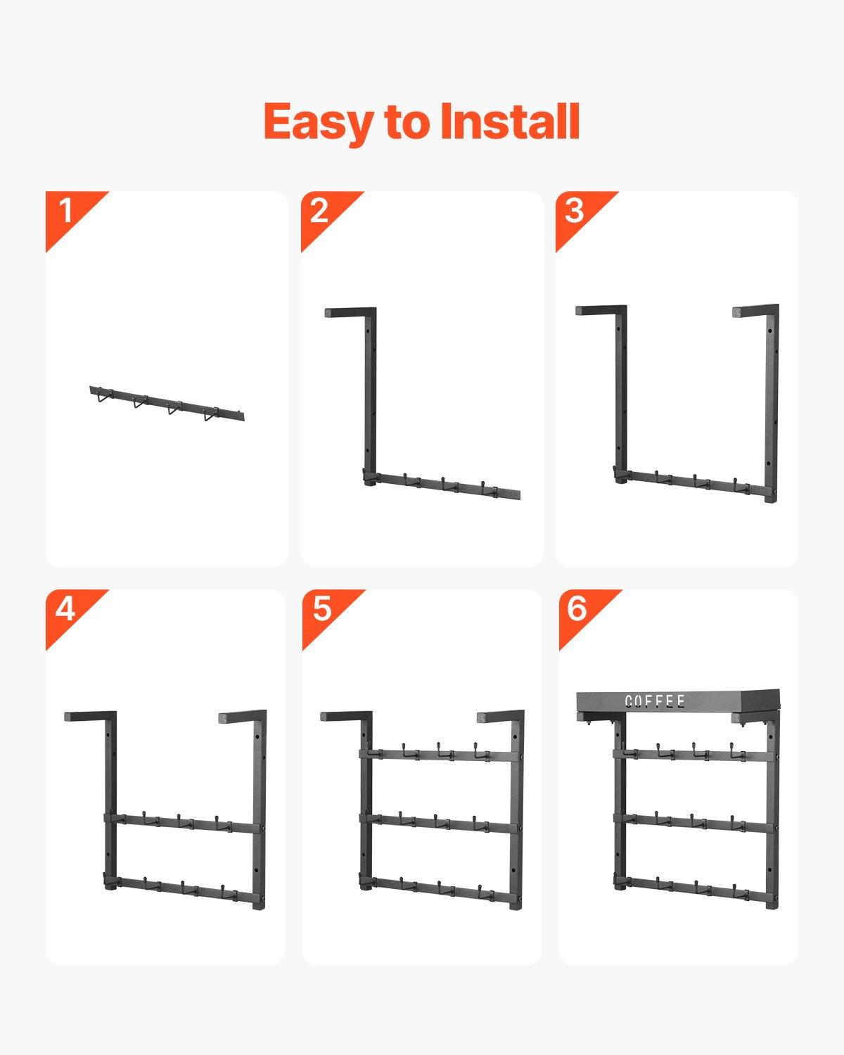 Wall-mounted coffee mug holder with 12 adjustable hooks and a top shelf for organized storage and space saving.