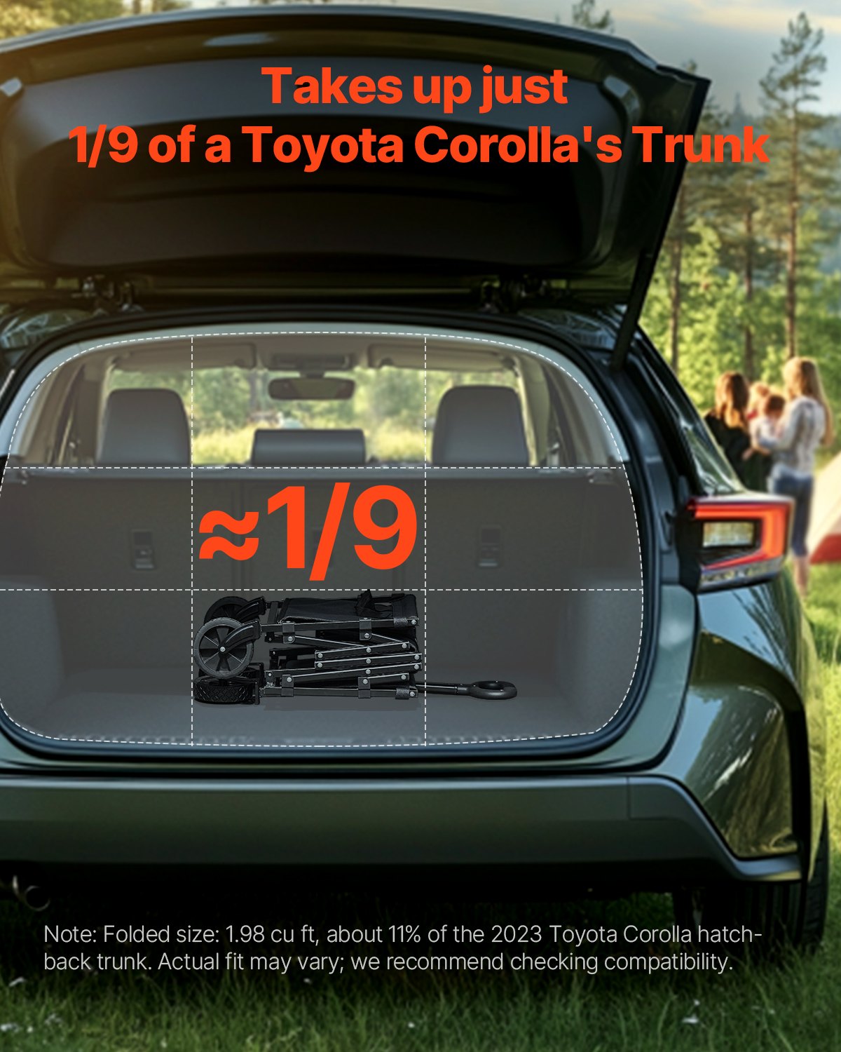 Folding wagon with 120L capacity and 225 lbs load, featuring all-terrain wheels and an adjustable handle for versatile outdoor use.