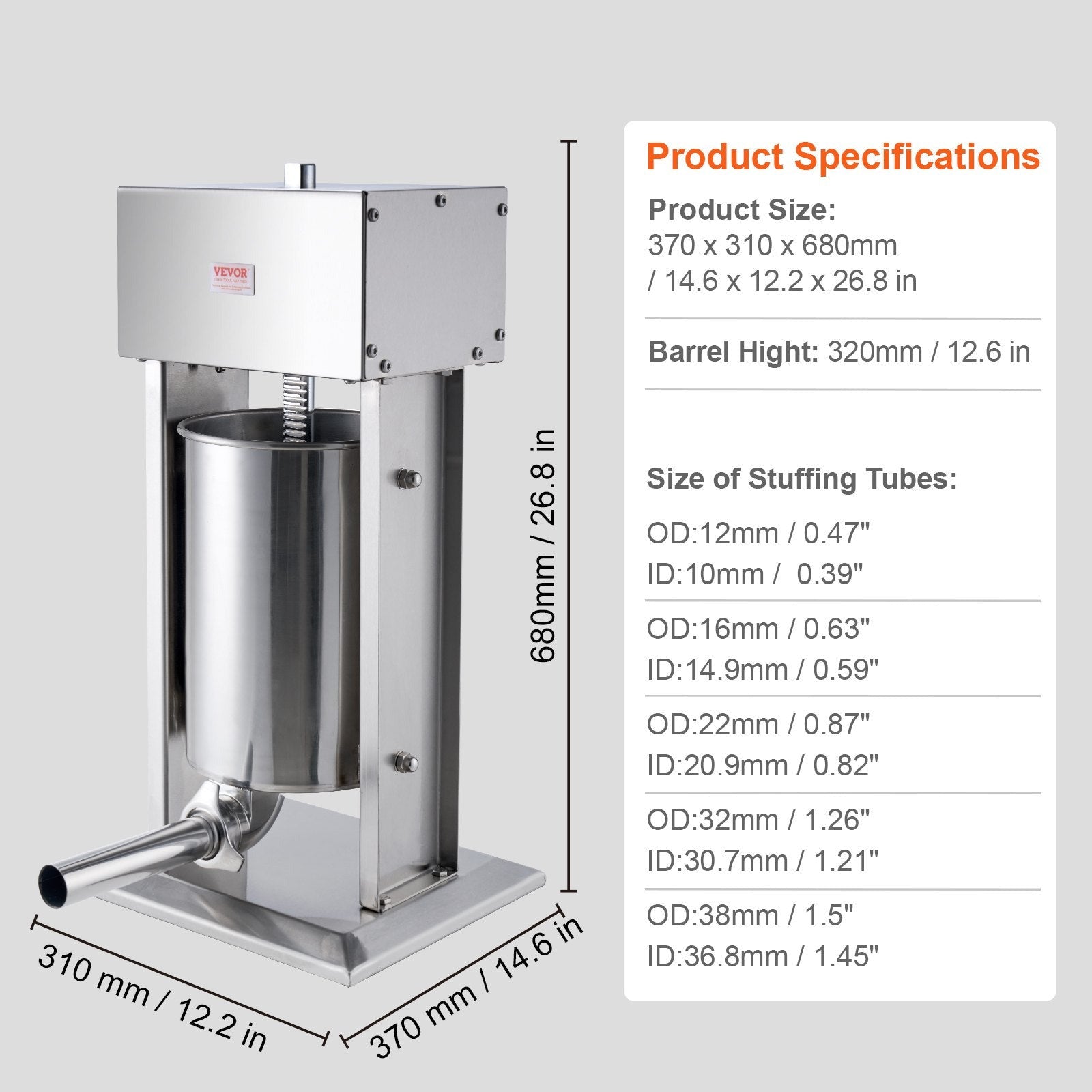 Electric sausage stuffer with 12L capacity, 200W motor, stepless speed control, foot pedal, and five stuffing tubes for efficient home or commercial use.
