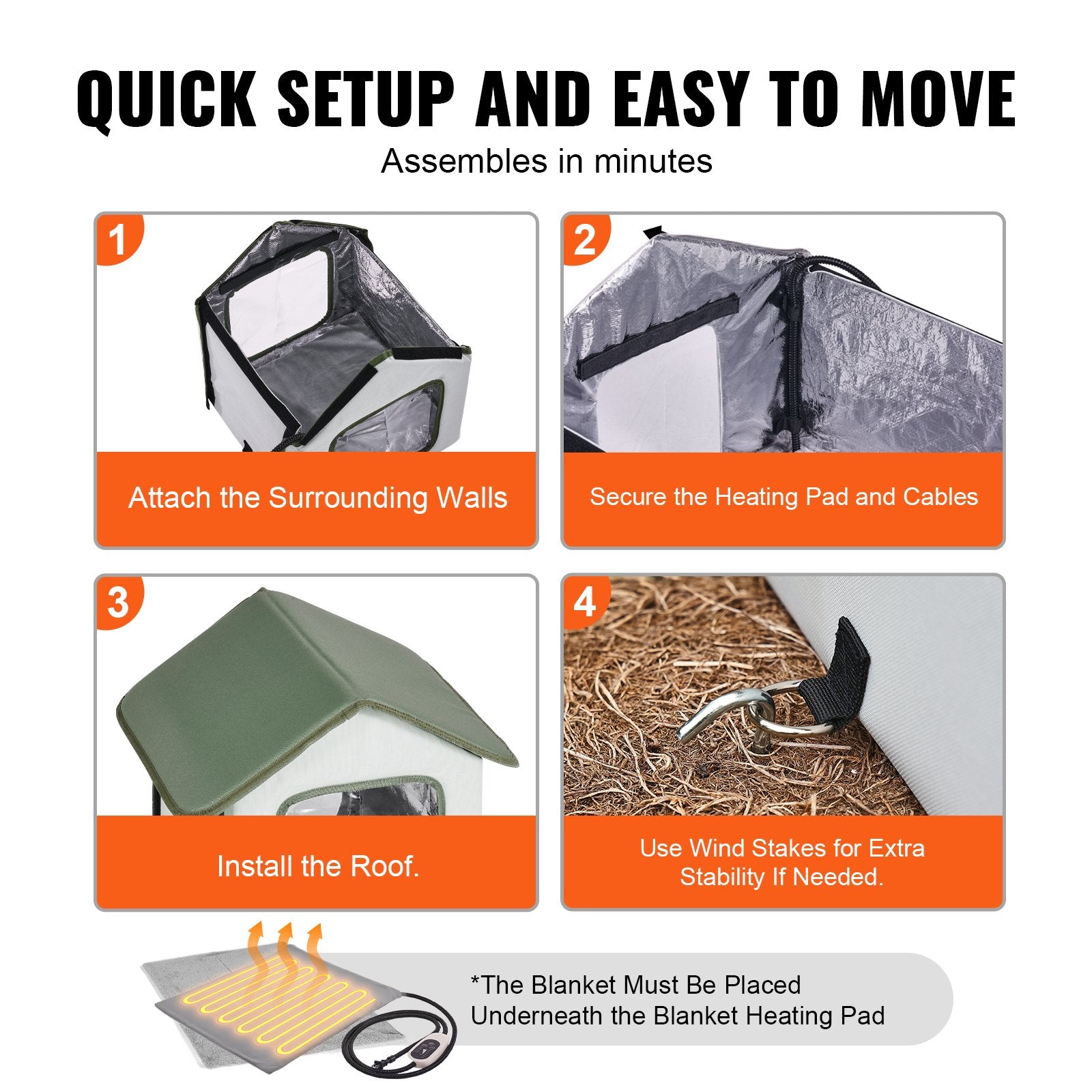 Outdoor heated cat house with timer, waterproof design, and insulation to keep pets warm and comfortable during cold weather.