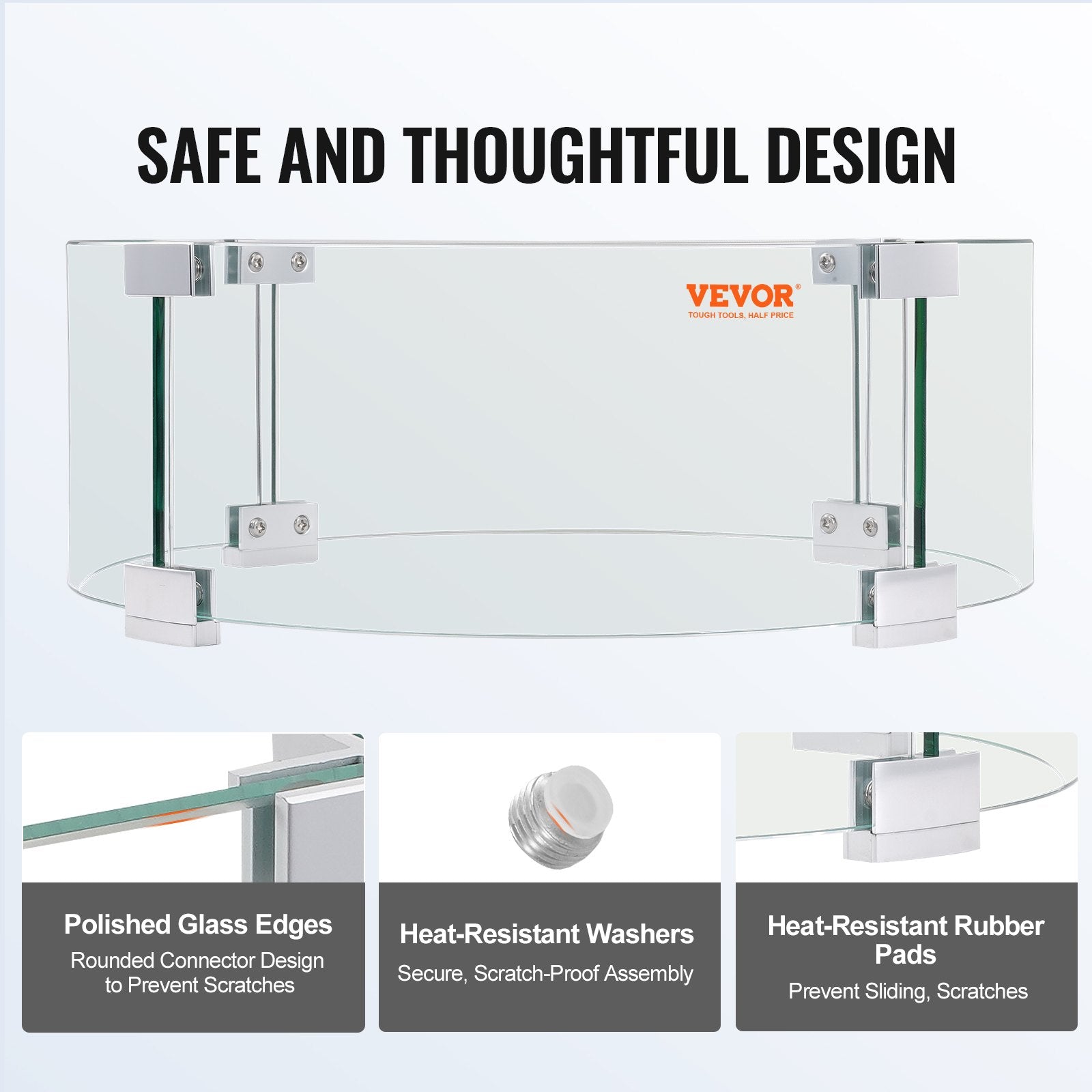 Tempered glass wind guard for fire pits, measuring 23 x 23 x 8 inches, with aluminum alloy feet for stability and protection against wind.