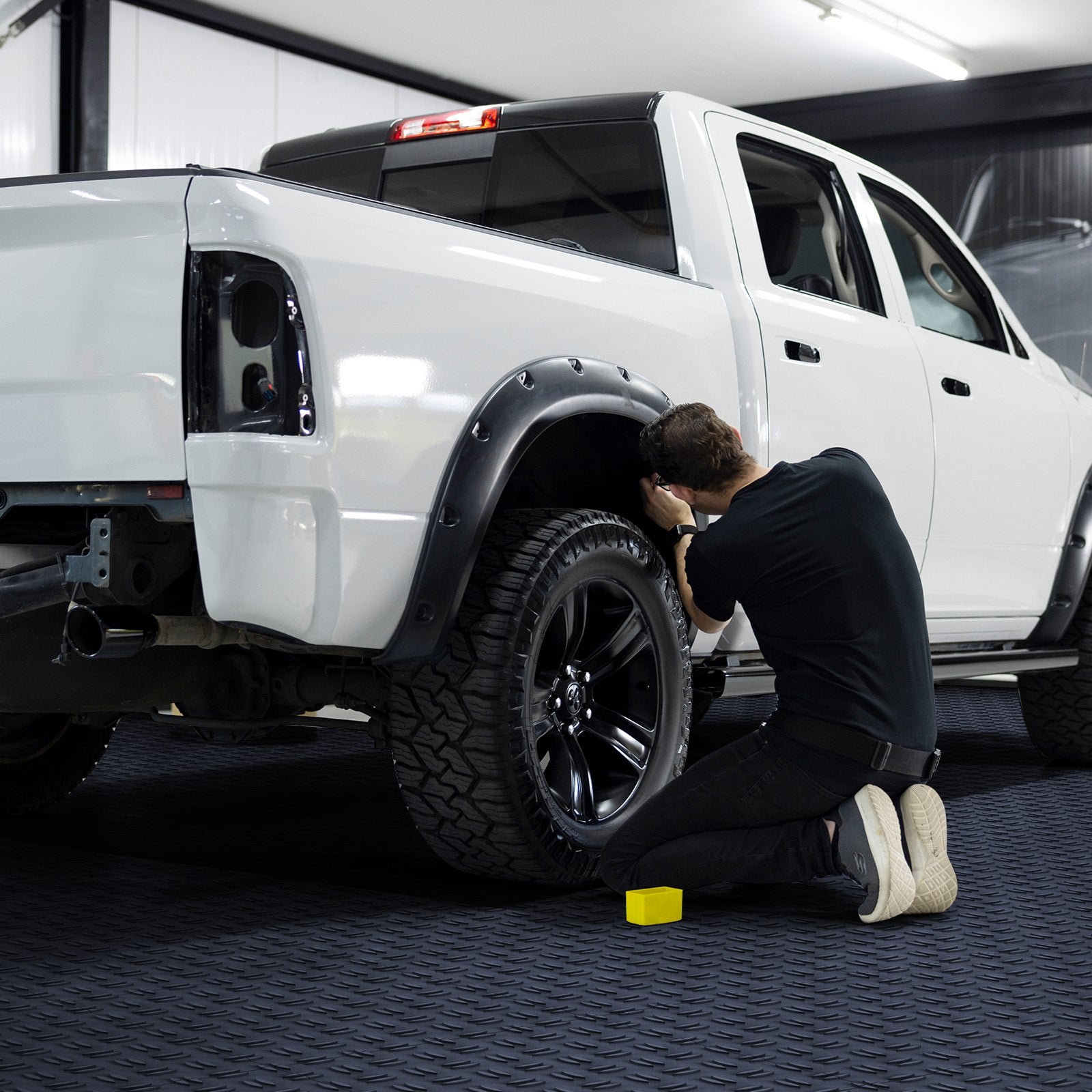 Durable interlocking garage floor tiles with non-slip double-sided texture, suitable for garages, basements, and repair shops.