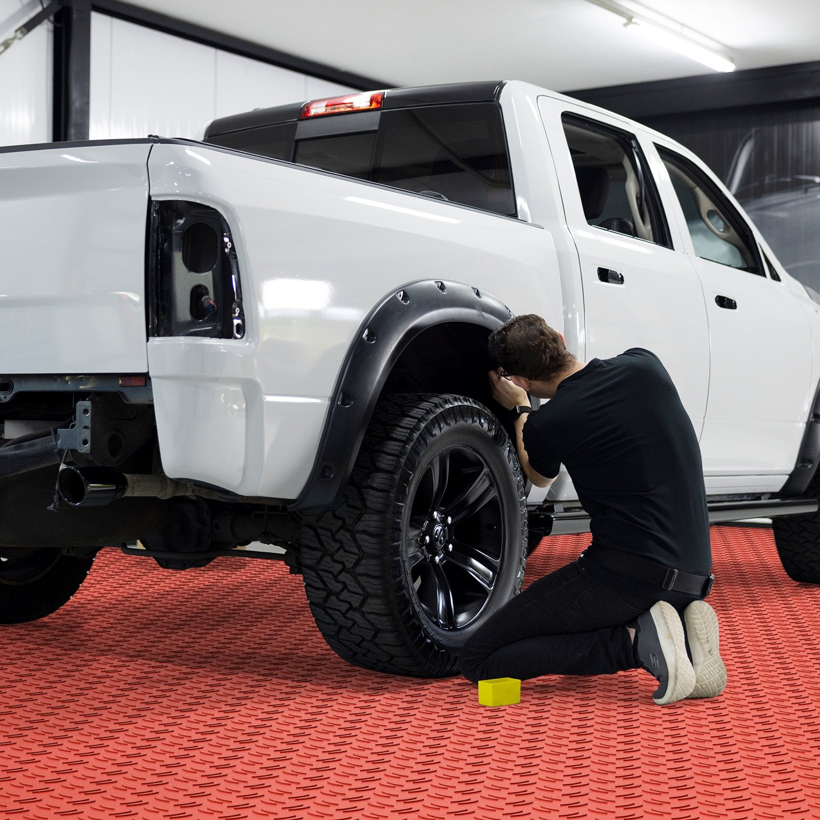 Interlocking garage floor tiles measuring 12x12 inches, designed for durability and easy installation in various settings.