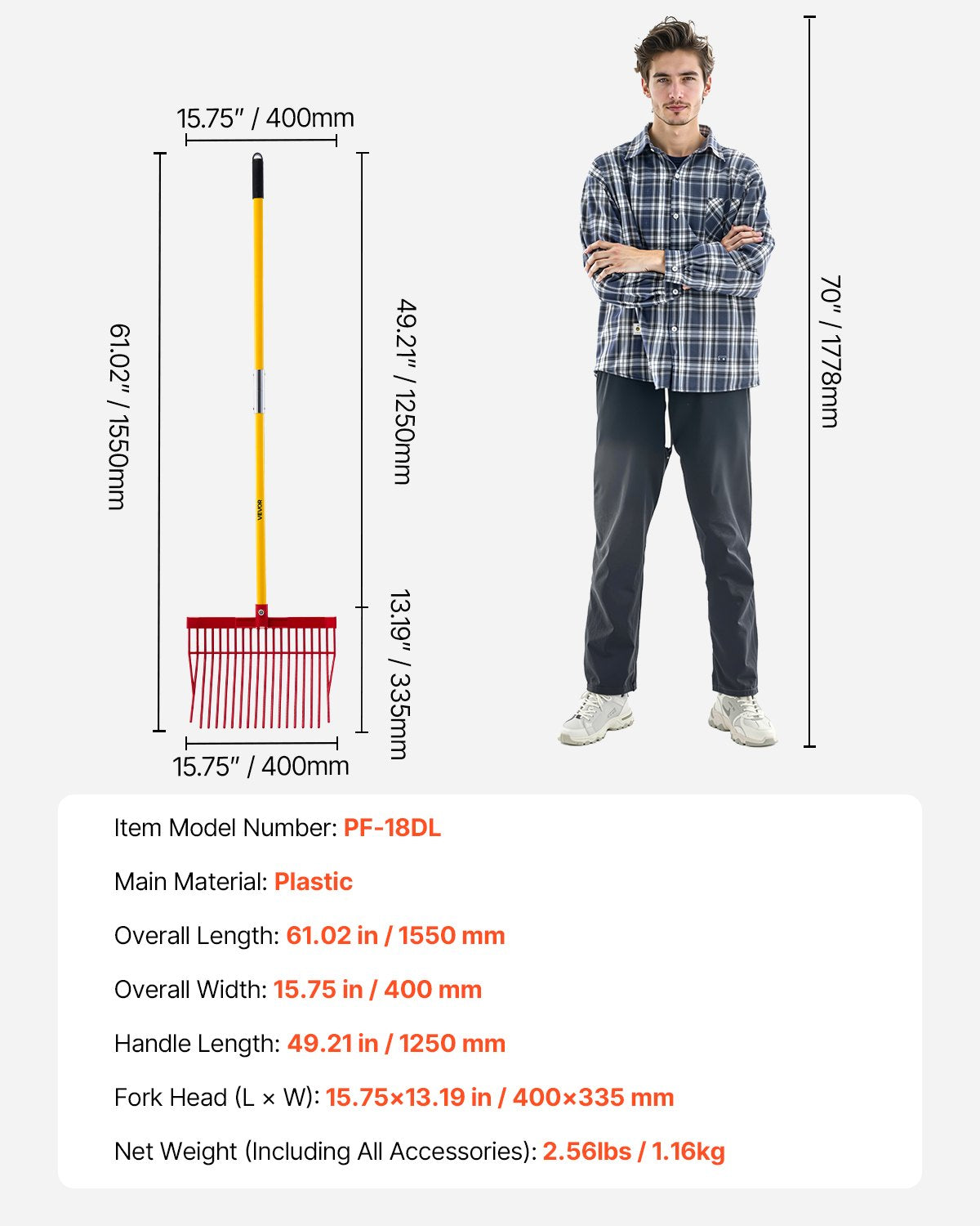 18-tine plastic pitchfork with fiberglass handle designed for efficient handling of hay, manure, and garden debris.