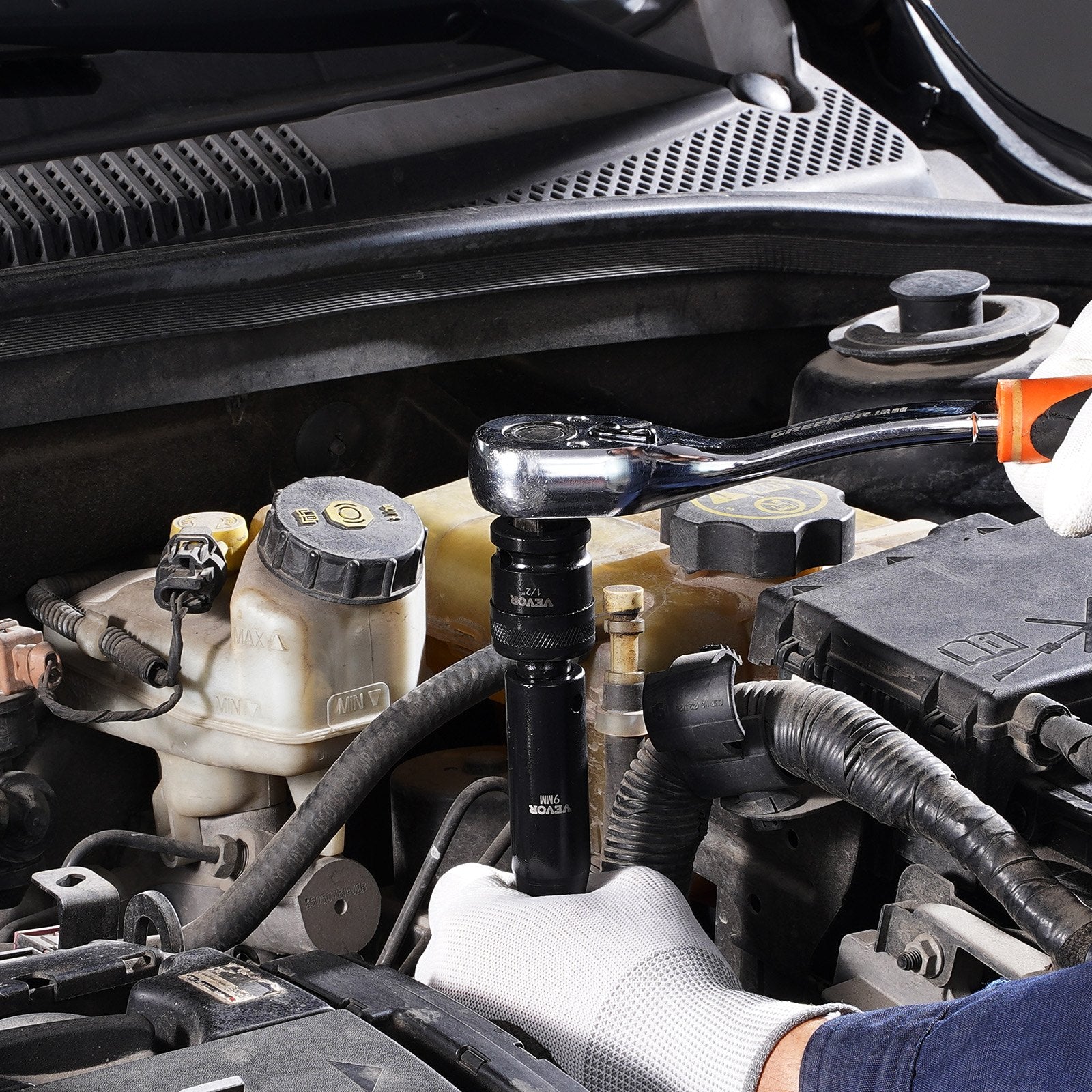 43-piece impact socket set with 6-point sockets ranging from 9mm to 30mm, including standard and deep sockets for various applications.