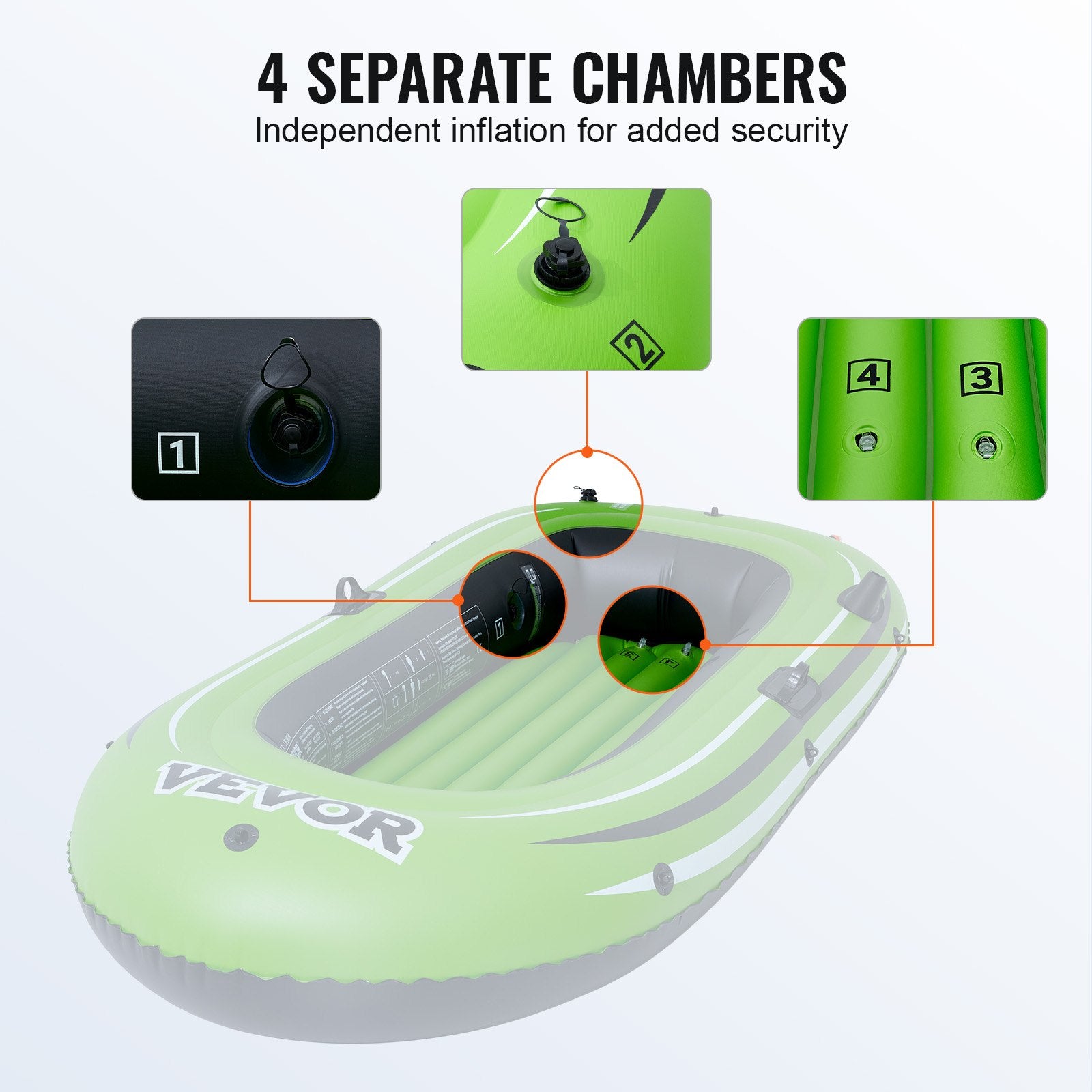Our inflatable fishing boat features 4 independent air chambers to enhance safety on the water. If one chamber is compromised, the others remain inflated, ensuring you can safely return to shore.