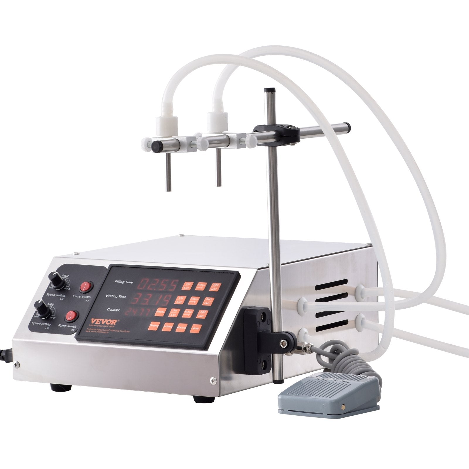 Automatic liquid filling machine with digital control, suitable for various low to medium-viscosity liquids, featuring dual nozzles and precise quantification.