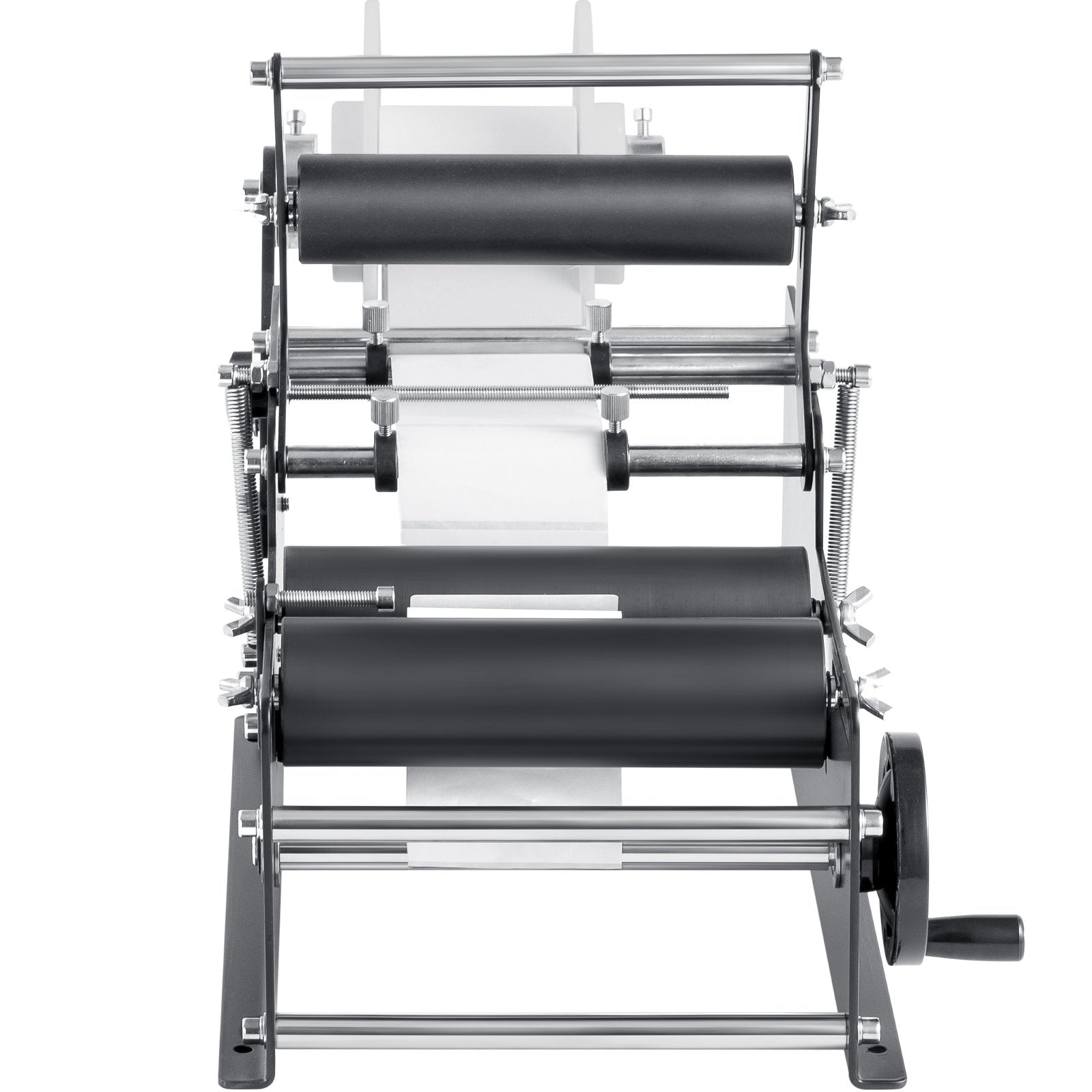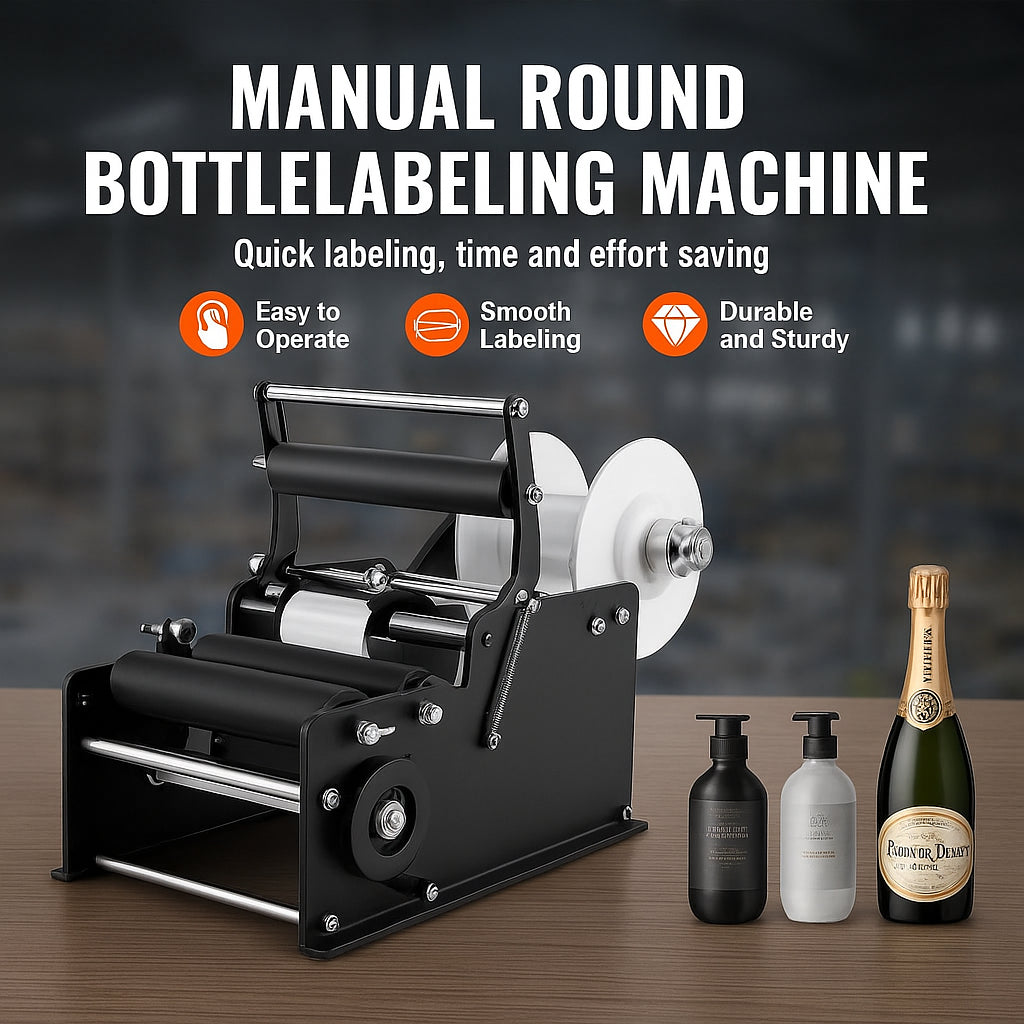 Manual round bottle labeling machine with adjustable settings for bottles 20-120 mm in diameter, applying 15-20 labels per minute with a pressing bar for smooth adhesion.