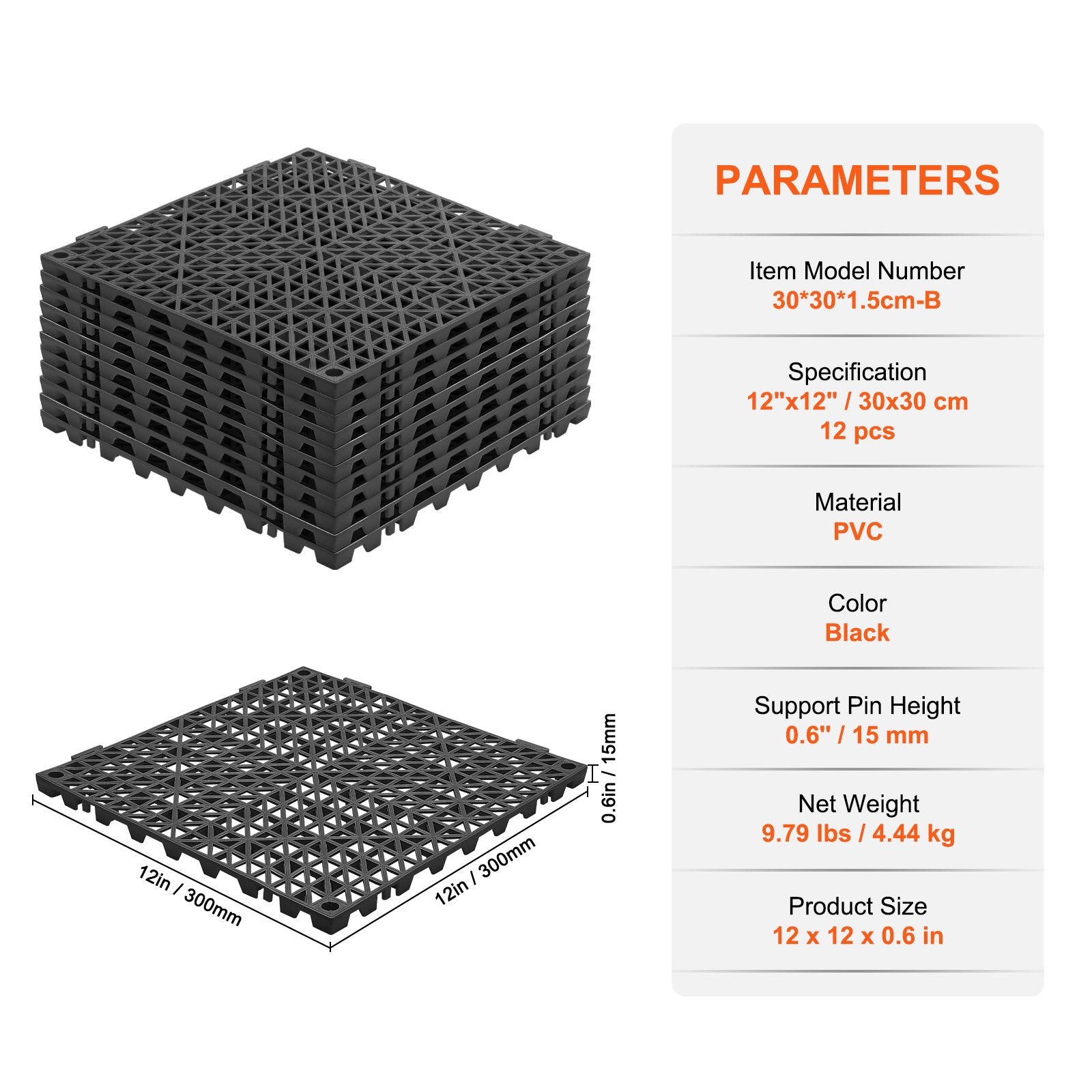 Set of 12 interlocking PVC drainage mats, 30 x 30 cm each, designed for non-slip, quick water drainage in wet areas like bathrooms and kitchens.