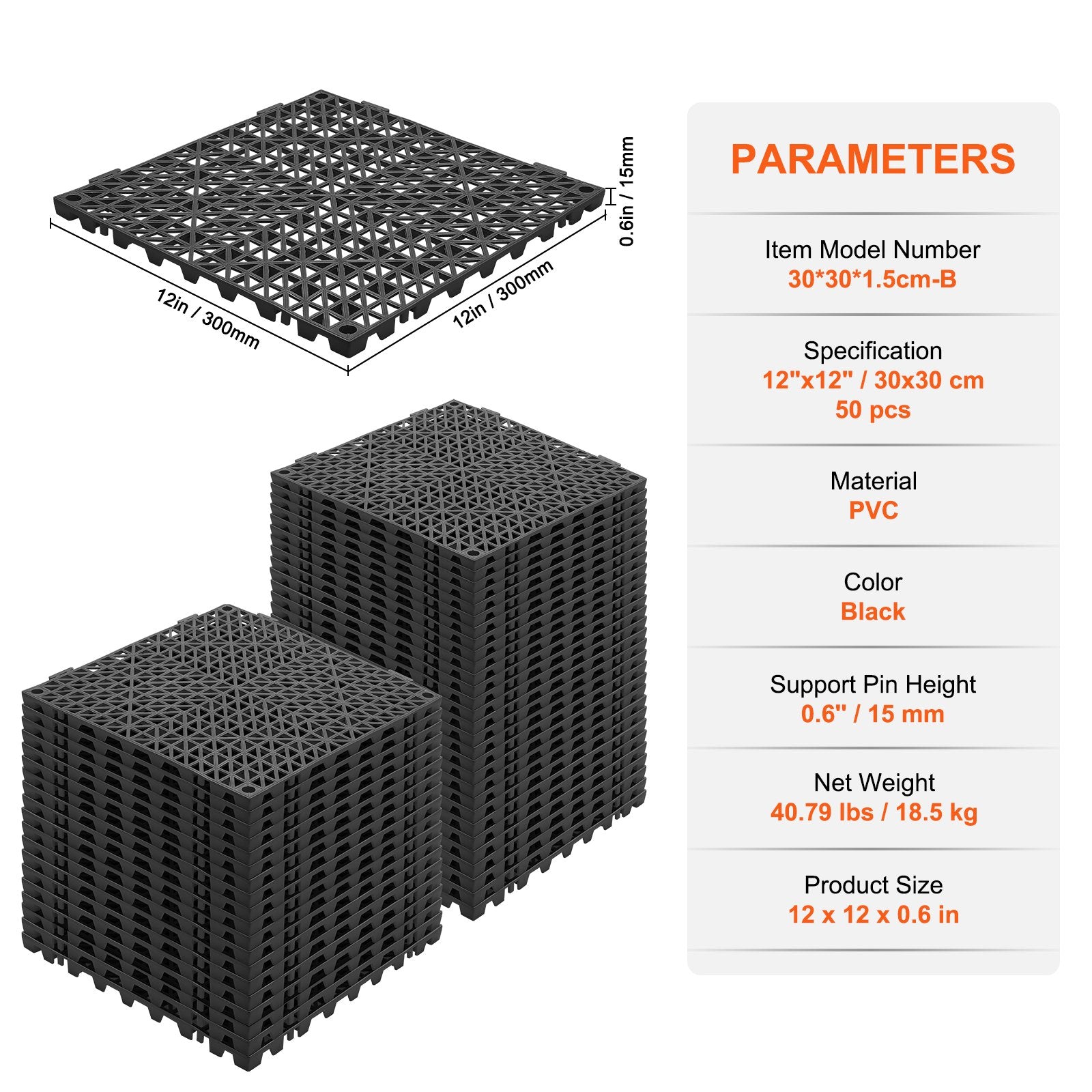 Modular interlocking drainage mats with non-slip holes, designed for wet areas including bathrooms, kitchens, and pools. Each tile measures 30 x 30 cm.