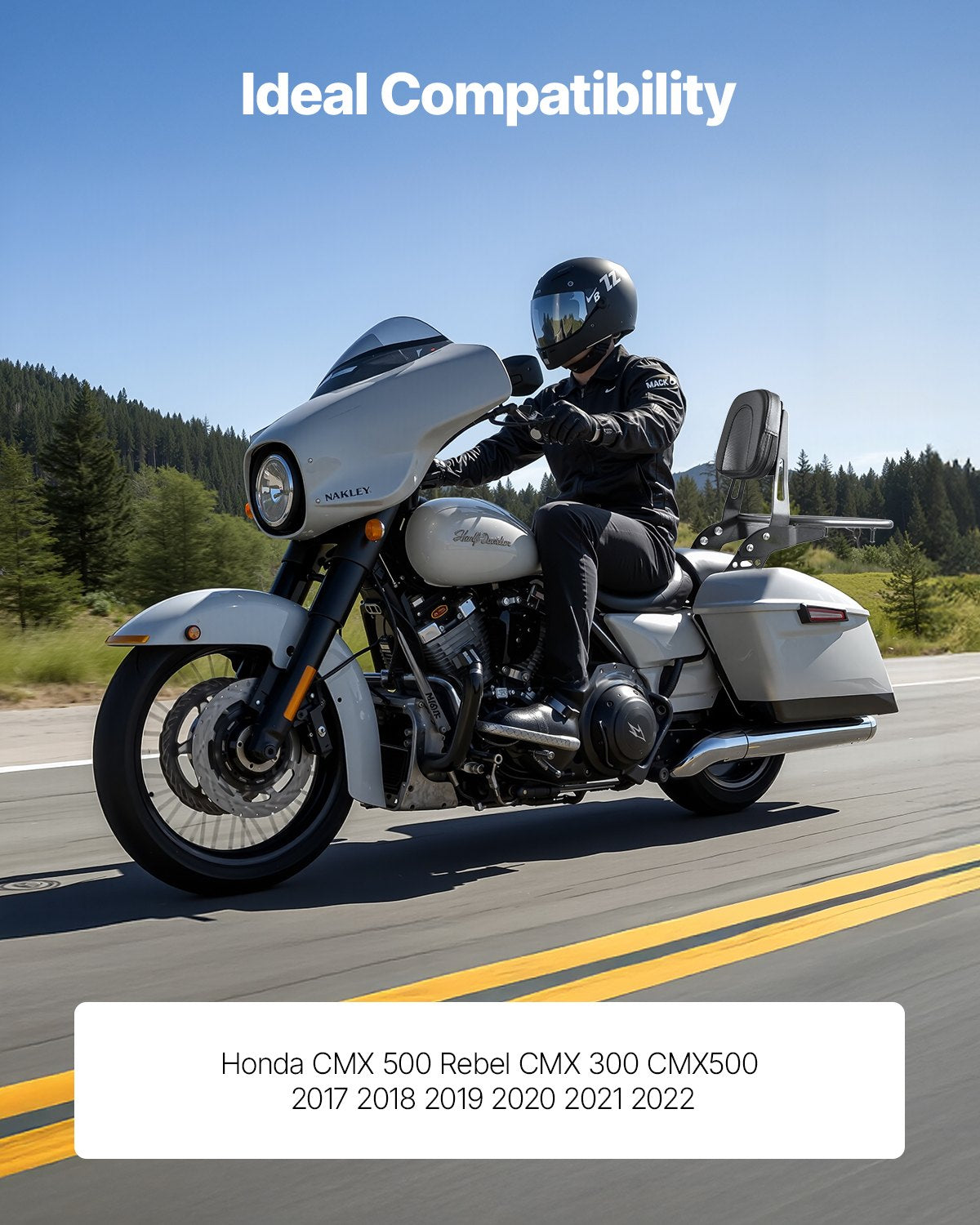 Motorcycle backrest sissy bar with luggage rack designed for Honda Rebel 2017-2022, offering comfort and durability with easy installation.