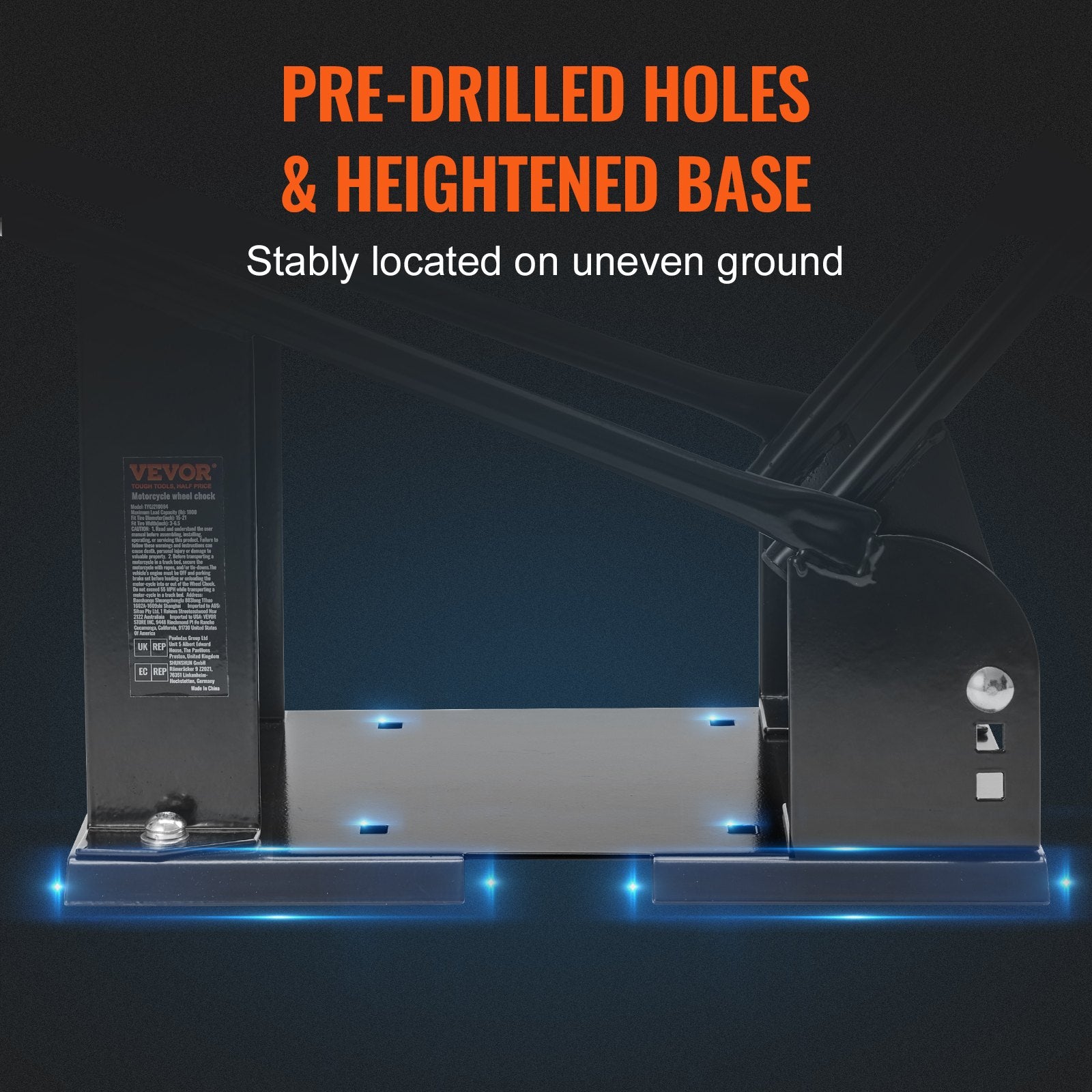 Heavy-duty motorcycle wheel chock with adjustable cradle, designed for front wheels 381-533.4 mm in diameter, supporting up to 816.5 kg.