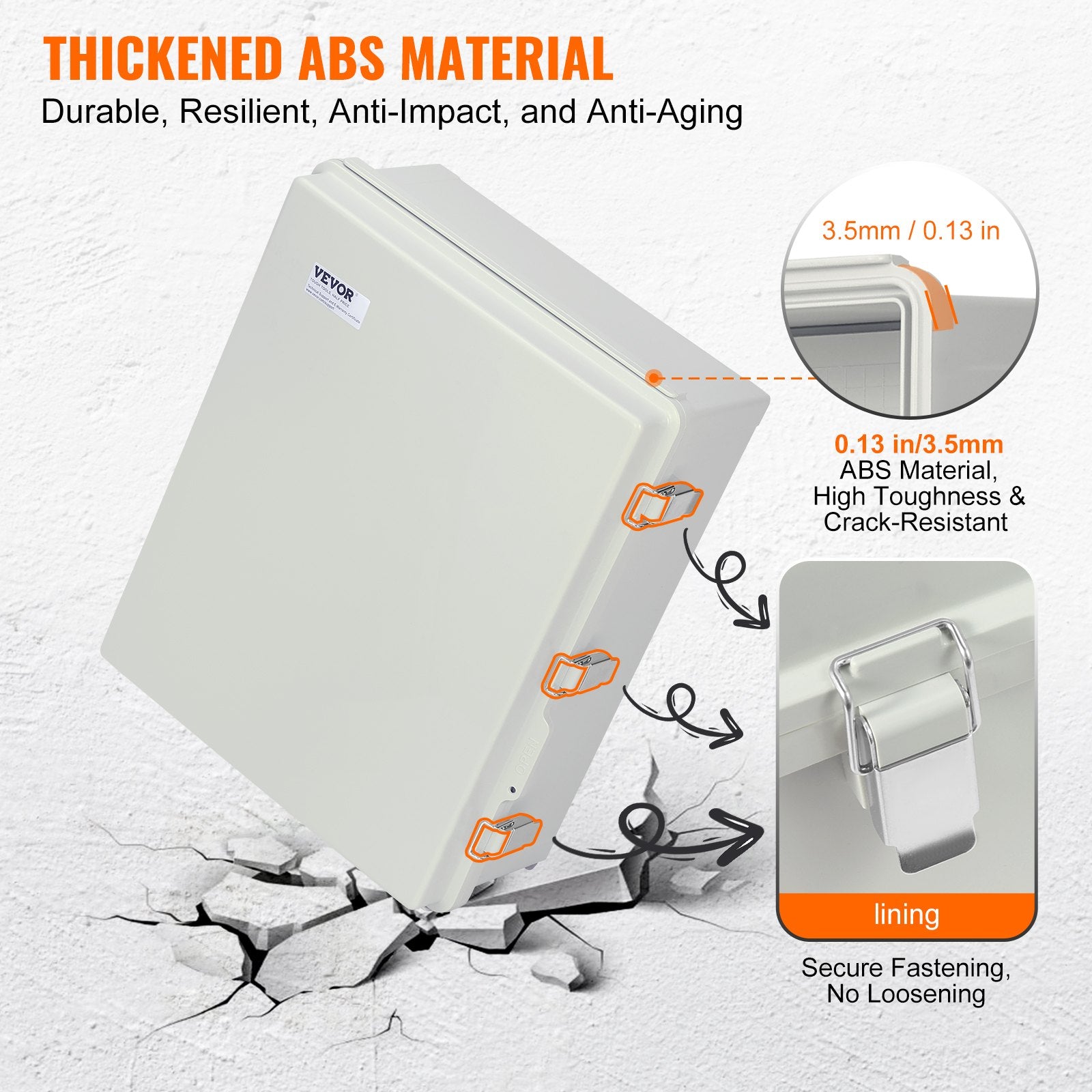 Outdoor electrical junction box with IP67 rating, ABS construction, hinged cover, and stainless steel latch for secure and durable protection.