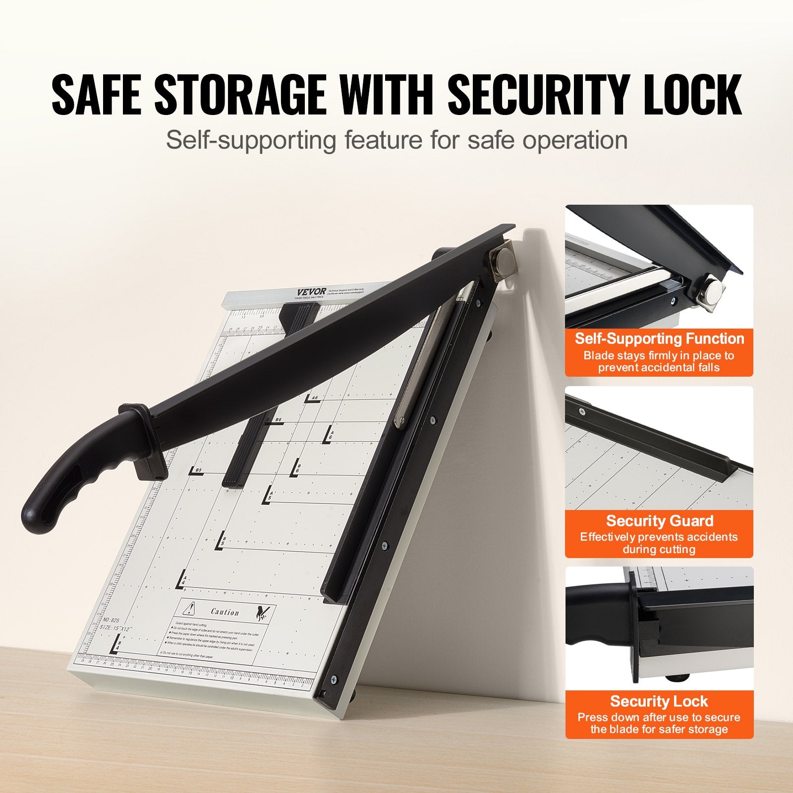 Heavy-duty guillotine paper cutter with a 381 mm cut length and 16-sheet capacity, designed for precise and secure trimming of various paper types.