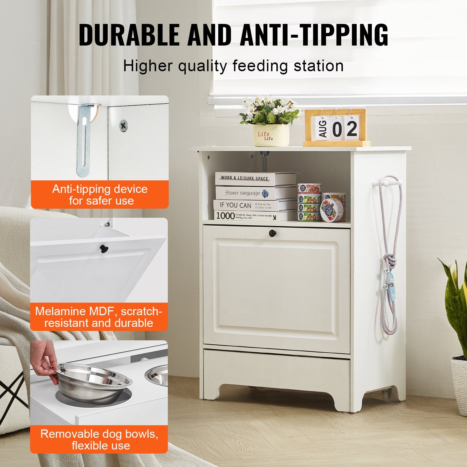 Elevated pet feeding station with two dog bowls and storage cabinet for food, toys, and accessories.