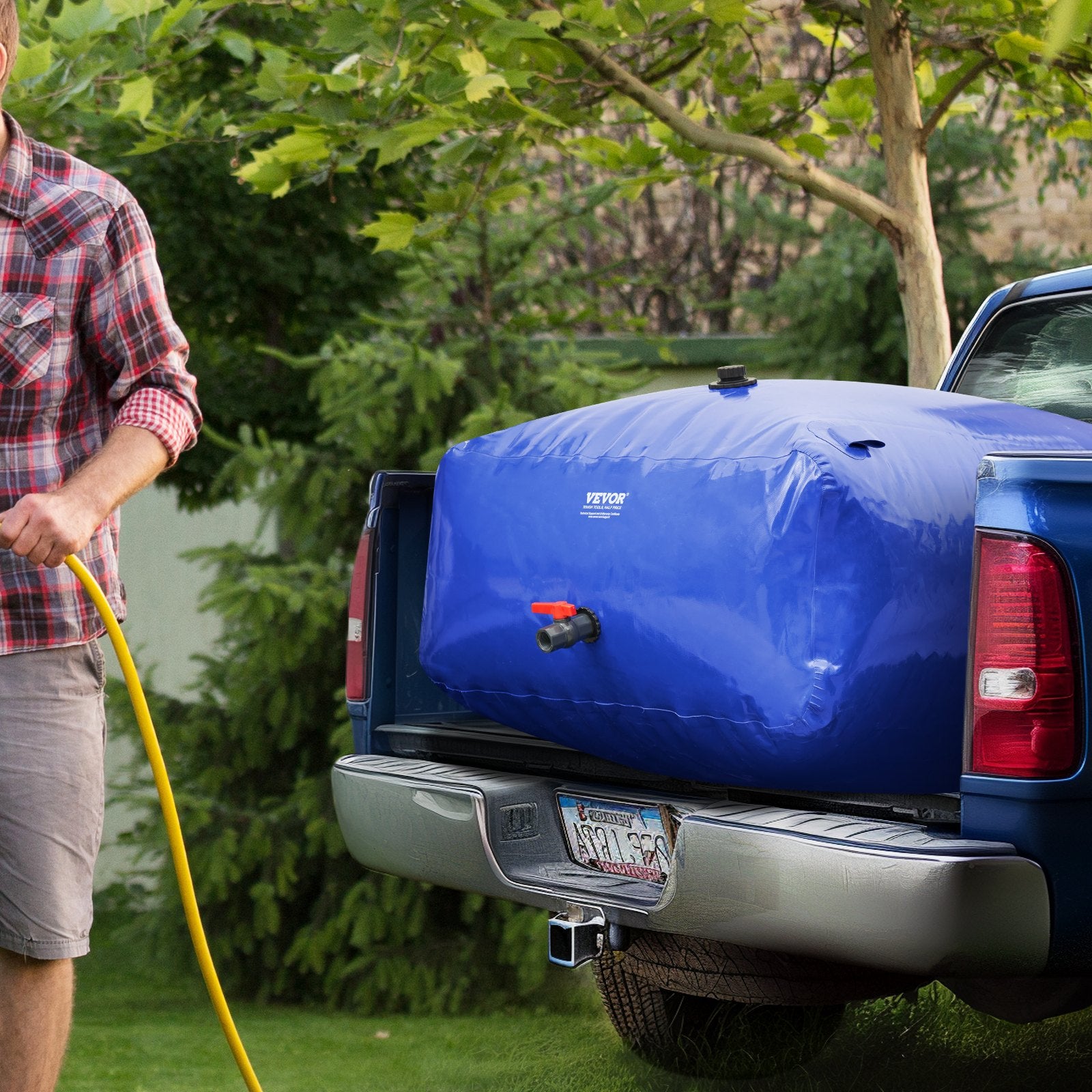 Portable collapsible water storage bladder with 264-gallon capacity made from durable 1000D PVC for versatile water storage needs.