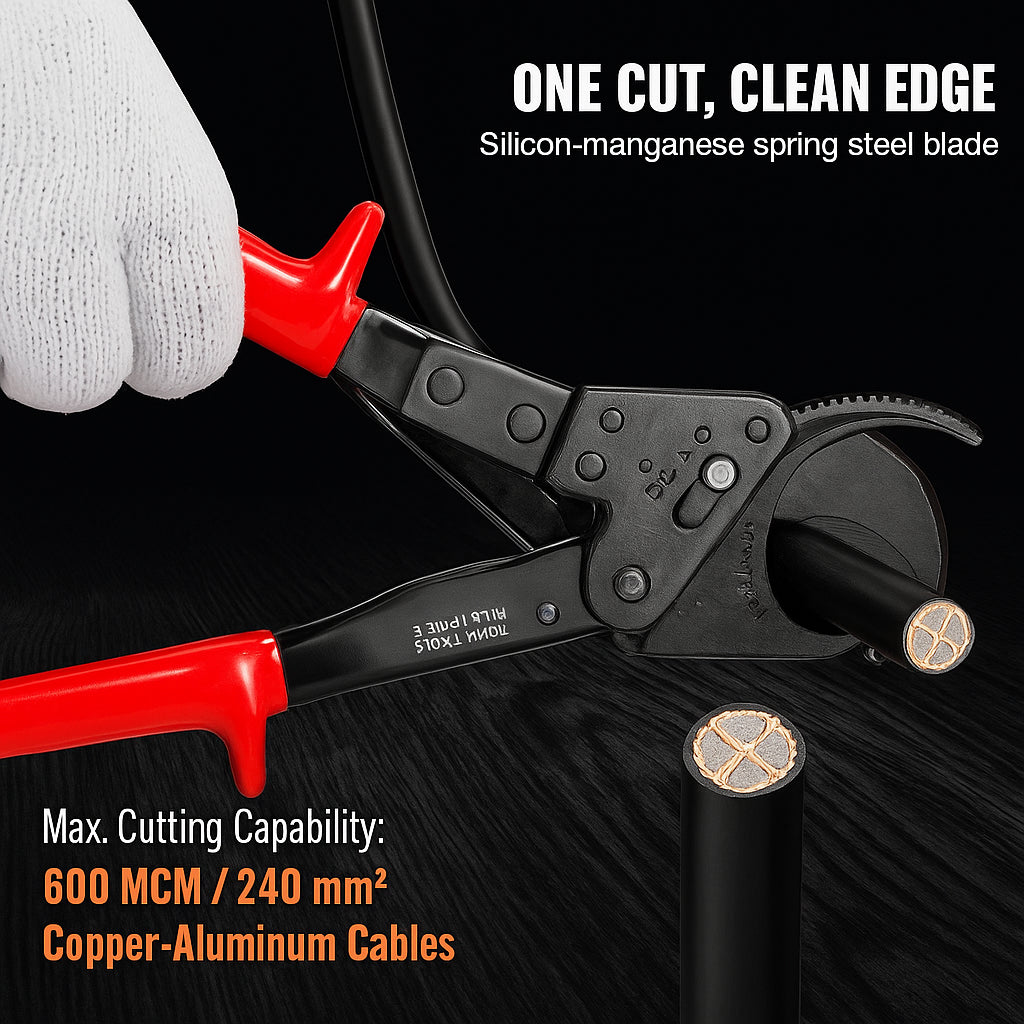 Ratcheting cable cutter with silicon-manganese spring steel blade, designed for cutting cables up to 240 mm² with comfortable grip handles and quick-release lever.