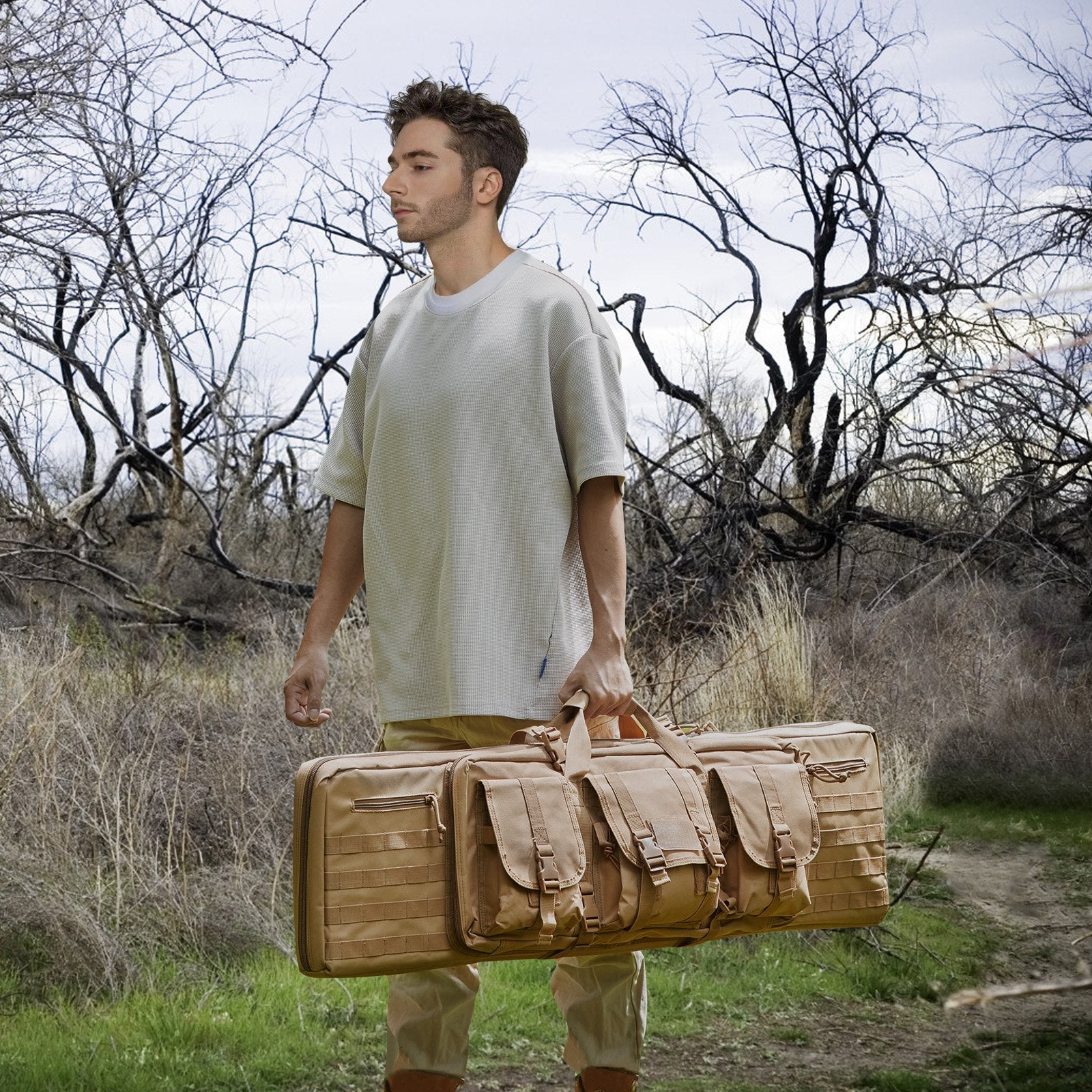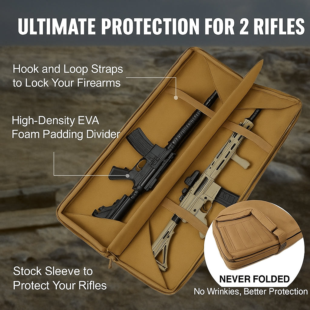 36-inch tactical rifle bag with compartments for two rifles and two pistols, featuring lockable zippers, multiple storage pockets, and versatile carrying options.