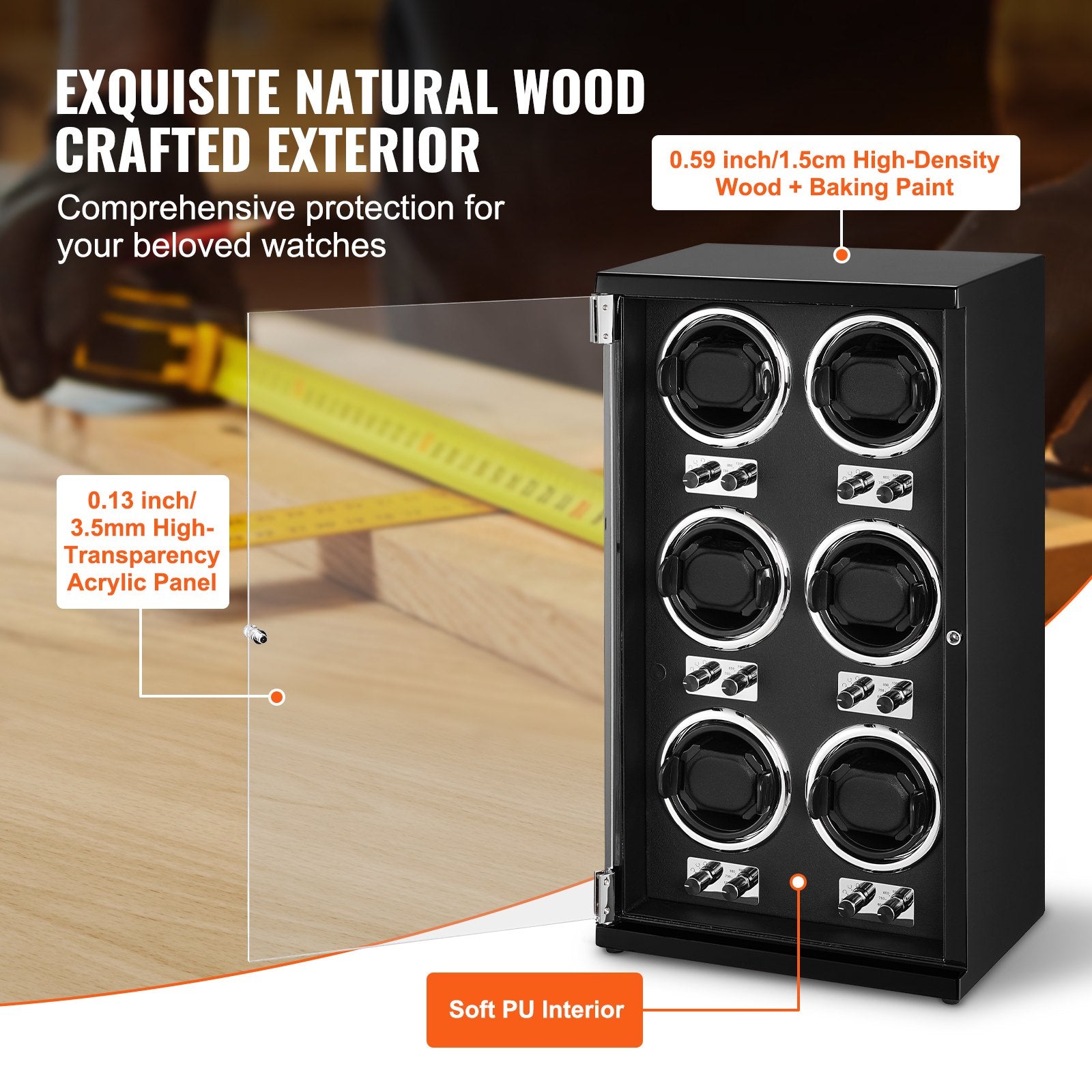 Watch winder for 6 automatic watches with quiet motors, multiple rotation modes, blue LED light, and durable construction.