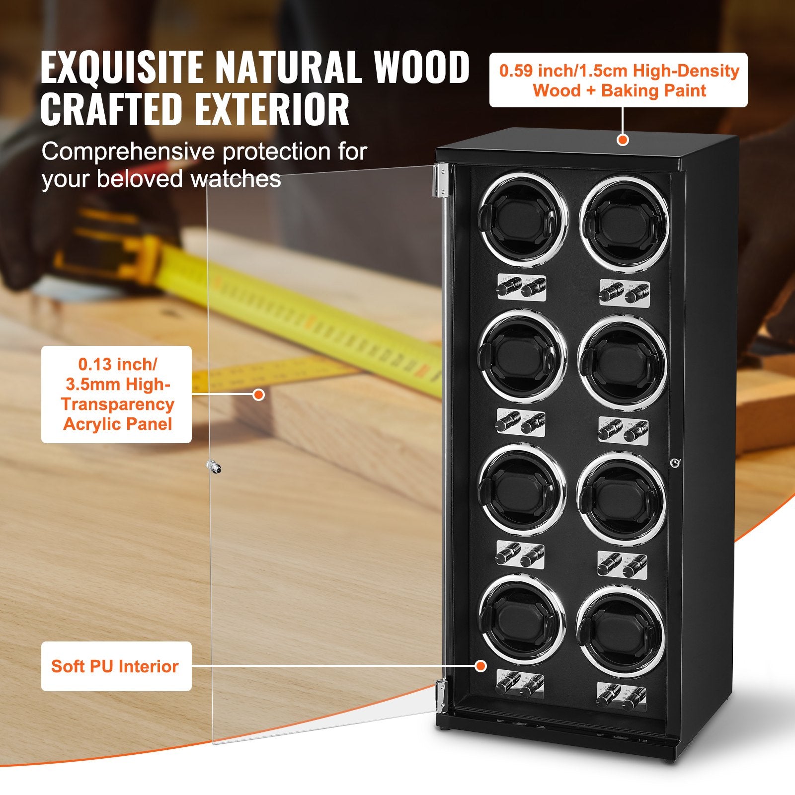 Watch winder for 8 automatic watches with quiet Japanese motors, adjustable rotation modes, blue LED light, and durable construction.
