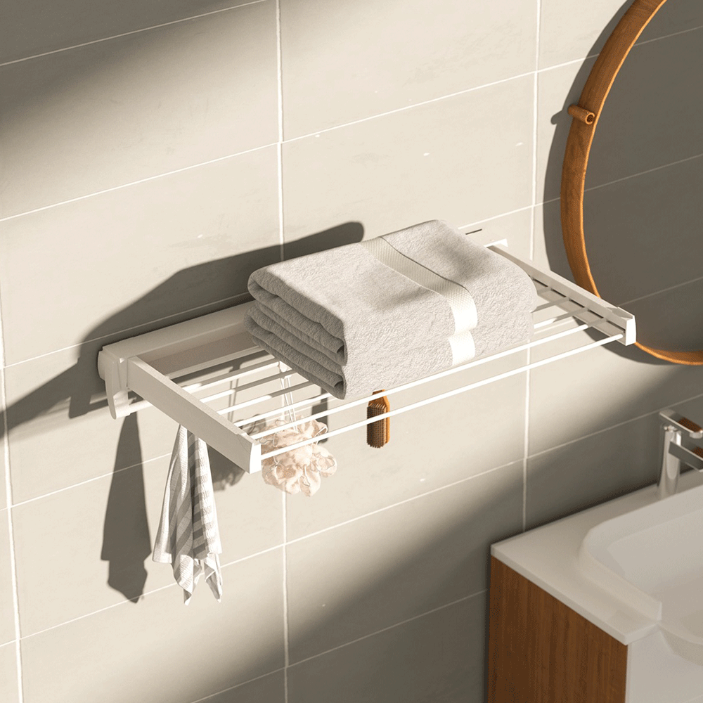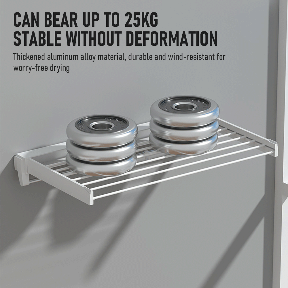 Crafted from durable space aluminum and ABS, this Wall-mounted Drying Rack offers an efficient space-saving solution with a 12KG bearing capacity. Equipped with foldable rail and 4 hooks, making it an ideal solution for laundry organization in both indoor and outdoor space.